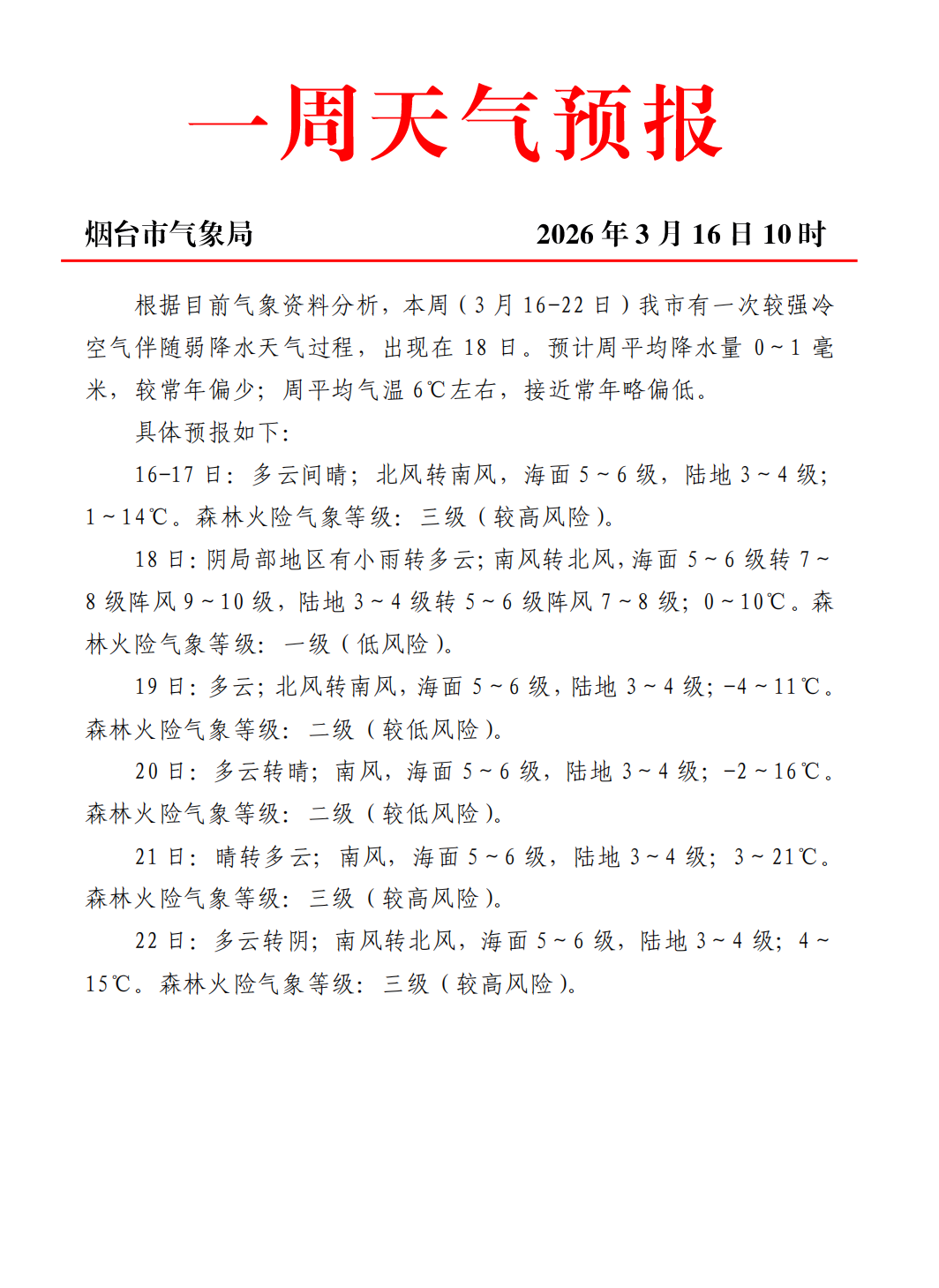 16—17日:多云间晴;北风转南风,海面5~6级,陆地3~4级;1~14℃。森林火险气象等级:三级(较高风险)。