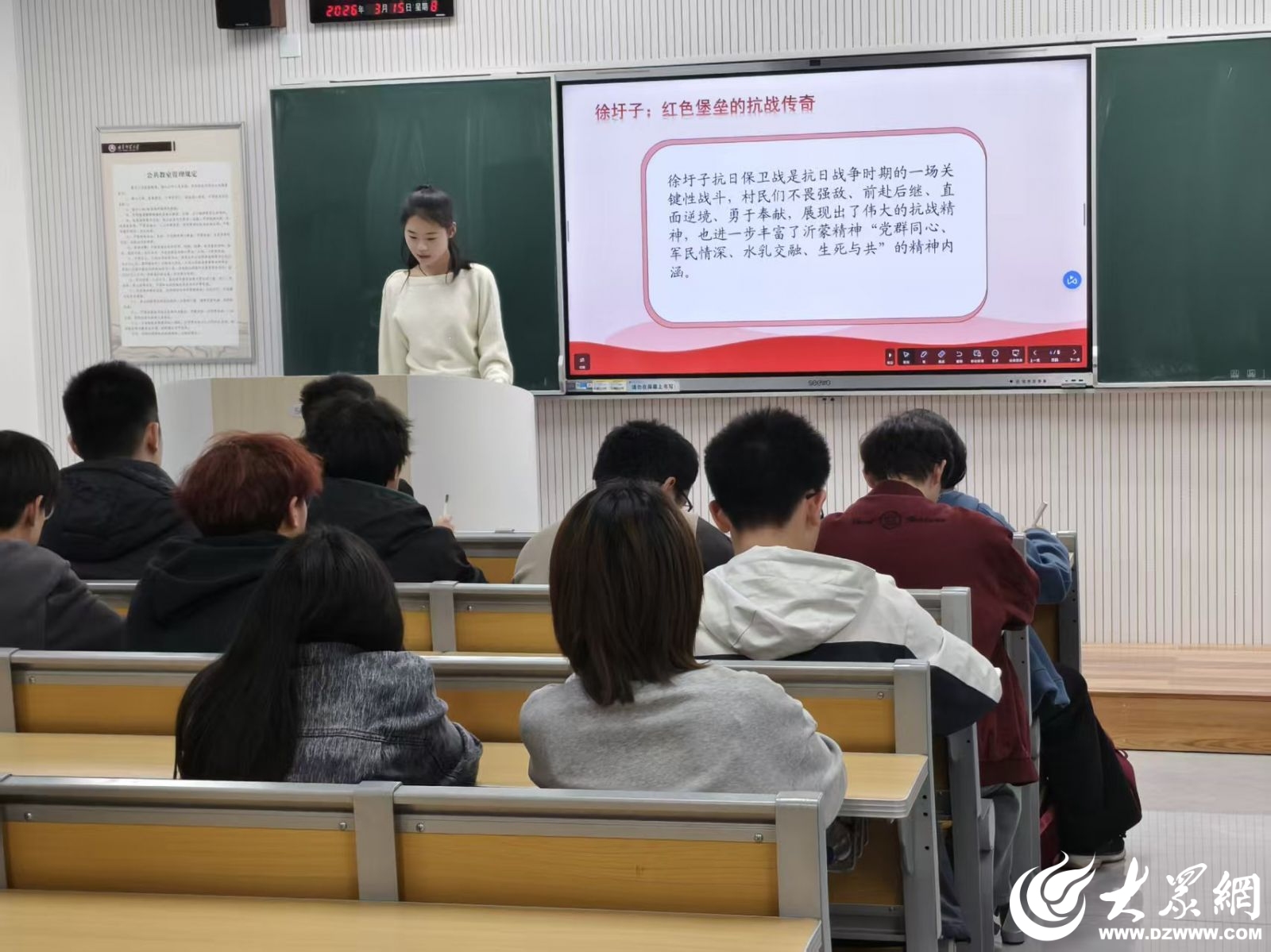 宣讲中,该同学结合前期实践经历,以徐圩子保卫战为切入点,通过八路军将士与当地群众同仇敌忾、浴血奋战的英勇事迹,引出了沂蒙精神“党群同心、军民情深、水乳交融、生死与共”的核心内涵。结合历史与现实,深入解读了沂蒙精神中蕴含的坚定信念、无私奉献、艰苦奋斗、爱党爱军等深厚意蕴,引导同学们深刻认识到,沂蒙精神不仅是中国共产党人精神谱系的重要组成部分,更是激励一代代齐鲁儿女砥砺前行的强大精神动力。聆听宣讲后,同学们纷纷表示,对沂蒙精神的历史渊源、深刻内涵和时代价值有了更加系统的认识,将自觉传承红色基因,把沂蒙精神融入日常学习和生活,脚踏实地学好专业知识,将来用所学本领回报家乡、服务社会。