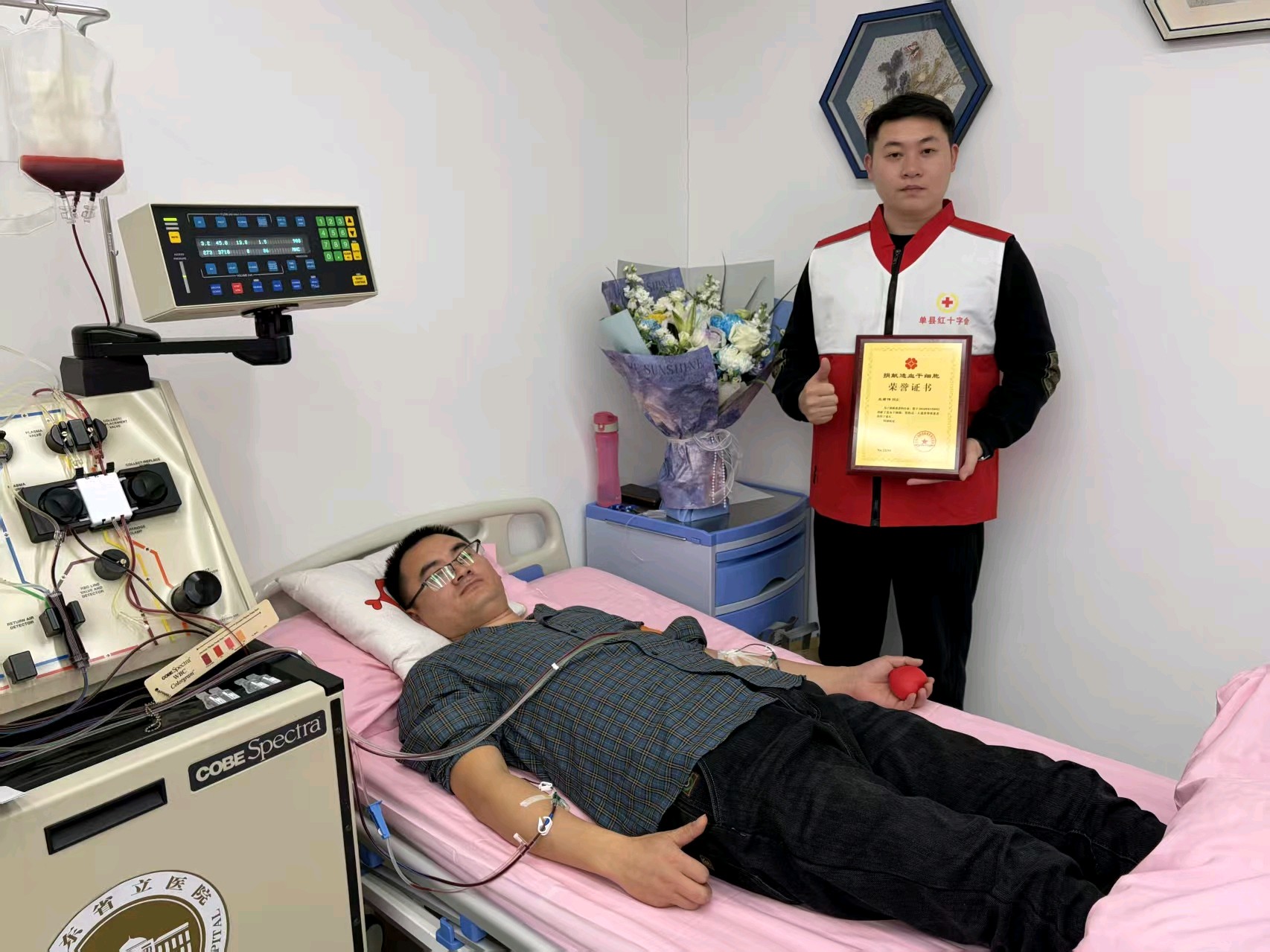 时隔3天,3月12日,这场生命的善意接力再次续写,单县第13例造血干细胞捐献者彭泉,在山东省立医院顺利完成捐献。现就职于新疆喀什地区英吉沙县司法局的彭泉,是一名扎根西部基层的青年援疆工作者。2018年大学毕业后,彭泉响应号召加入全国大学生志愿服务西部计划,远赴新疆喀什,服务期满后,他选择放弃回到家乡的机会,留在了这片他为之奉献的土地,扎根基层一线,用青春和坚守书写着援疆青年的责任与担当。接到配型成功的通知后,彭泉毫不犹豫许下了“我愿意”的承诺,为了保障捐献顺利进行,他严格遵照医嘱调整生活状态,做好了万全准备。捐献当天,经过规范采集,285毫升承载着生命希望的造血干细胞混悬液顺利采集完成,即将跨越山海,为远方的患者送去新生的曙光。