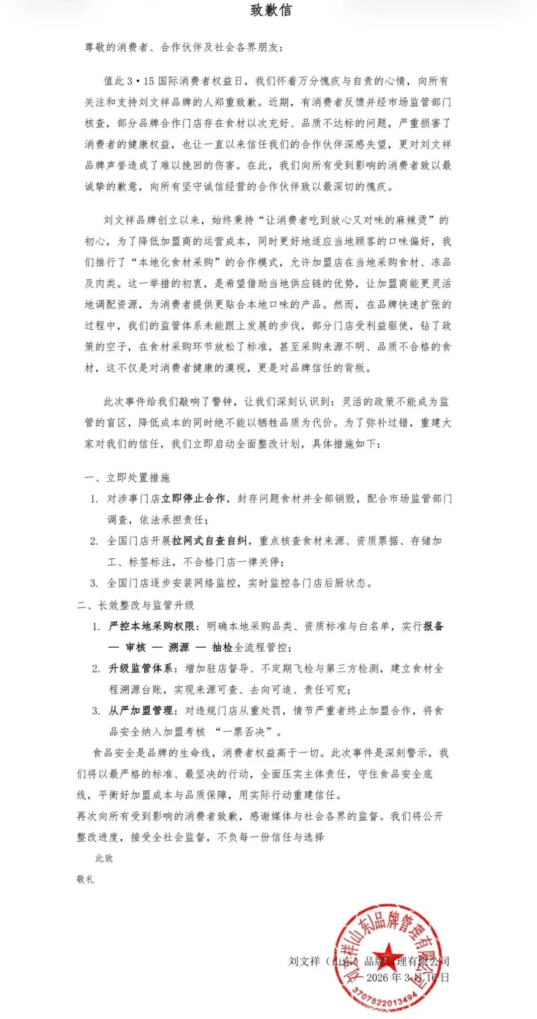 3月16日,刘文祥发布致歉信,其中提到整改措施: