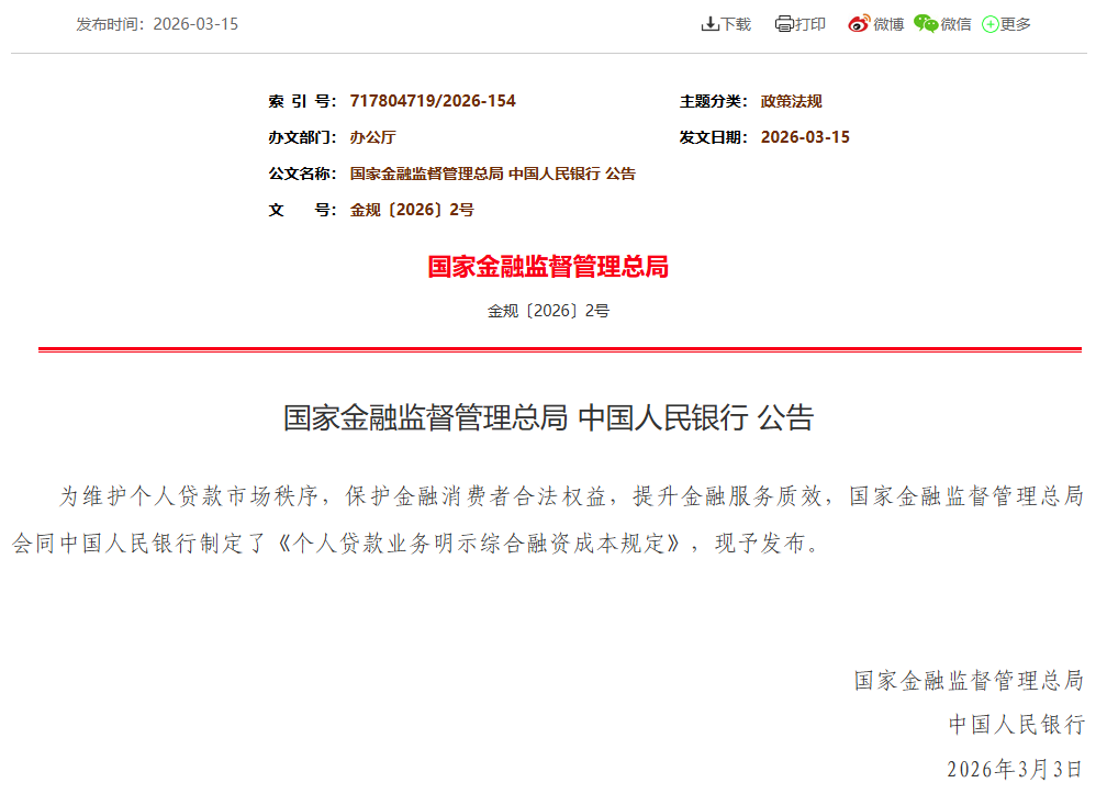 3月15日,国家金融监管总局会同中国人民银行制定了《个人贷款业务明示综合融资成本规定》(以下简称为《规定》或新规)。《规定》共11条,自2026年8月1日起施行。《规定》提到,贷款人开展个人贷款业务时,应当向借款人展示综合融资成本明示表。