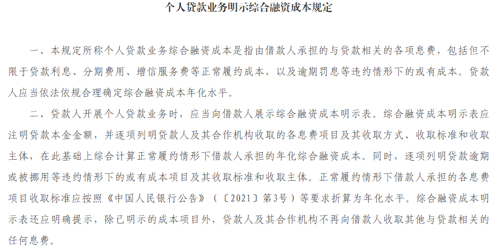 《规定》其中指出,“个人贷款业务综合融资成本是指由借款人承担的与贷款相关的各项息费,包括但不限于贷款利息、分期费用、增信服务费等正常履约成本,以及逾期罚息等违约情形下的或有成本。”“贷款人开展个人贷款业务时,应当向借款人展示综合融资成本明示表。”“正常履约情形下借款人承担的各息费项目收取标准应按照《中国人民银行公告》(〔2021〕第3号)等要求折算为年化水平。除已明示的成本项目外,贷款人及其合作机构不再向借款人收取其他与贷款相关的任何息费。”