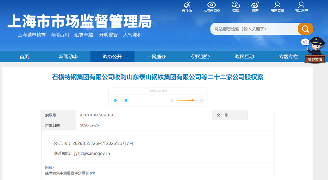 经济导报记者注意到,2月26日,上海市市场监督管理局公示了《石横特钢集团有限公司收购山东泰山钢铁集团有限公司(下称“泰钢集团”)等二十二家公司股权案》。