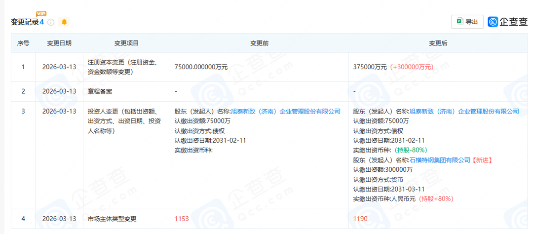 据企查查,泰钢控股成立于2026年2月13日,位于山东省济南市莱芜区,由旭泰新致(济南)企业管理股份有限公司(下称“旭泰新致”)出资7.5亿元全资持股。石横特钢出资后,泰钢控股大股东由旭泰新致变更为石横特钢,泰钢控股的注册资本由7.5亿元增至37.5亿元,旭泰新致对泰钢控股的持股比例由100%减至20%。
