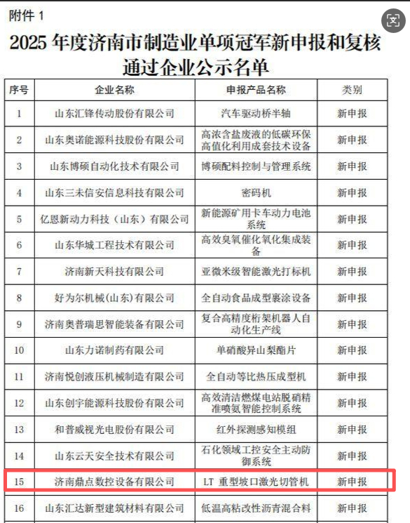 近日,济南“智造”军团再传佳音!济南市工业和信息化局公示2025年度制造业单项冠军企业名单,起步区鼎点激光以其核心产品——“LT重型坡口激光切管机”的卓越市场竞争力与技术领先性,成功登榜,荣获“济南市制造业单项冠军企业”称号,成为济南市激光装备赛道上一颗冉冉升起的实力派新星。