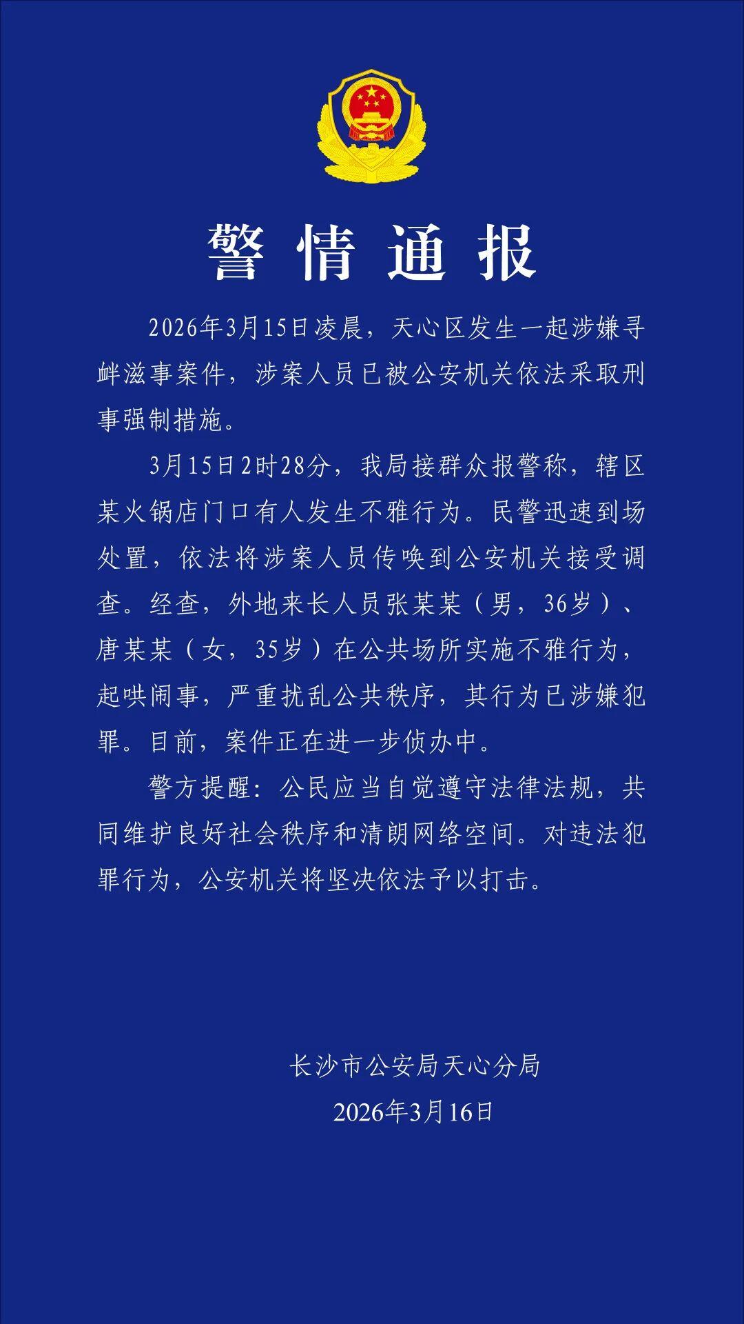 3月15日2时28分,我局接群众报警称,辖区某火锅店门口有人发生不雅行为。民警迅速到场处置,依法将涉案人员传唤到公安机关接受调查。经查,外地来长人员张某某(男,36岁)、唐某某(女,35岁)在公共场所实施不雅行为,起哄闹事,严重扰乱公共秩序,其行为已涉嫌犯罪。目前,案件正在进一步侦办中。