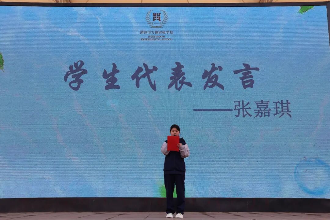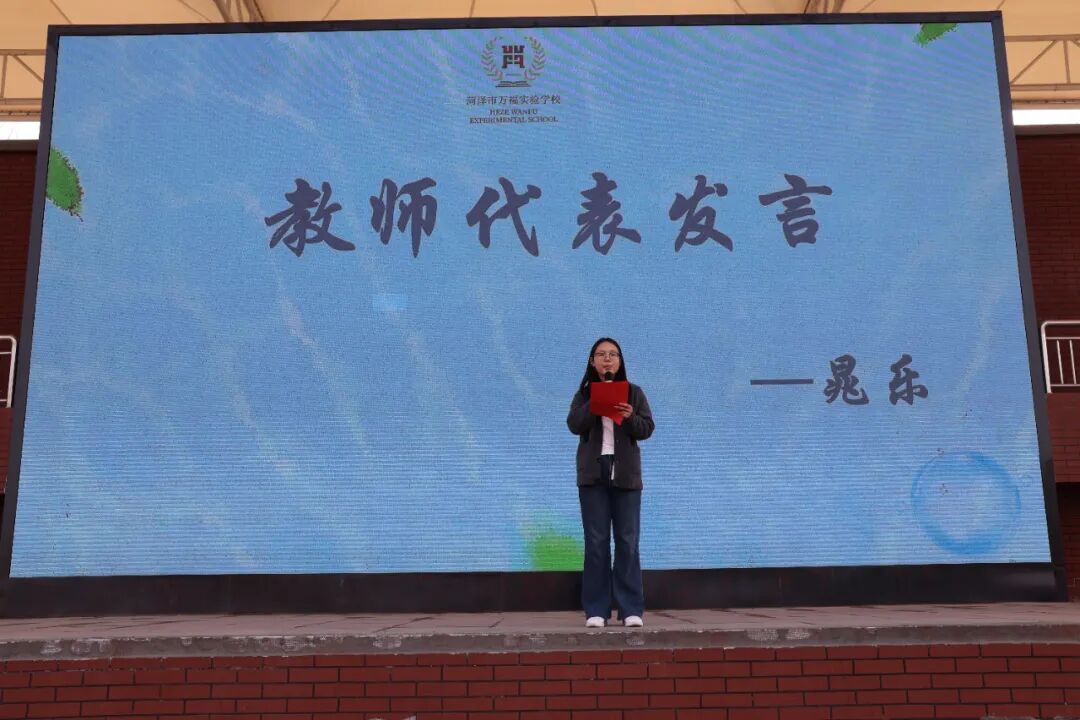 教师代表晁乐老师上台,为师生解读节水护水的重要意义,从生态文明建设角度指引绿色生活方向,以谆谆教诲传递节水护水的责任与期望。