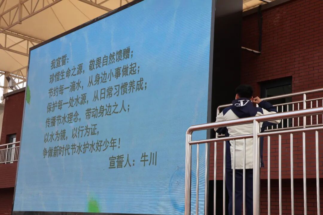 学生代表牛川带领全体同学庄严宣誓,以铿锵誓言立下节水护水承诺。