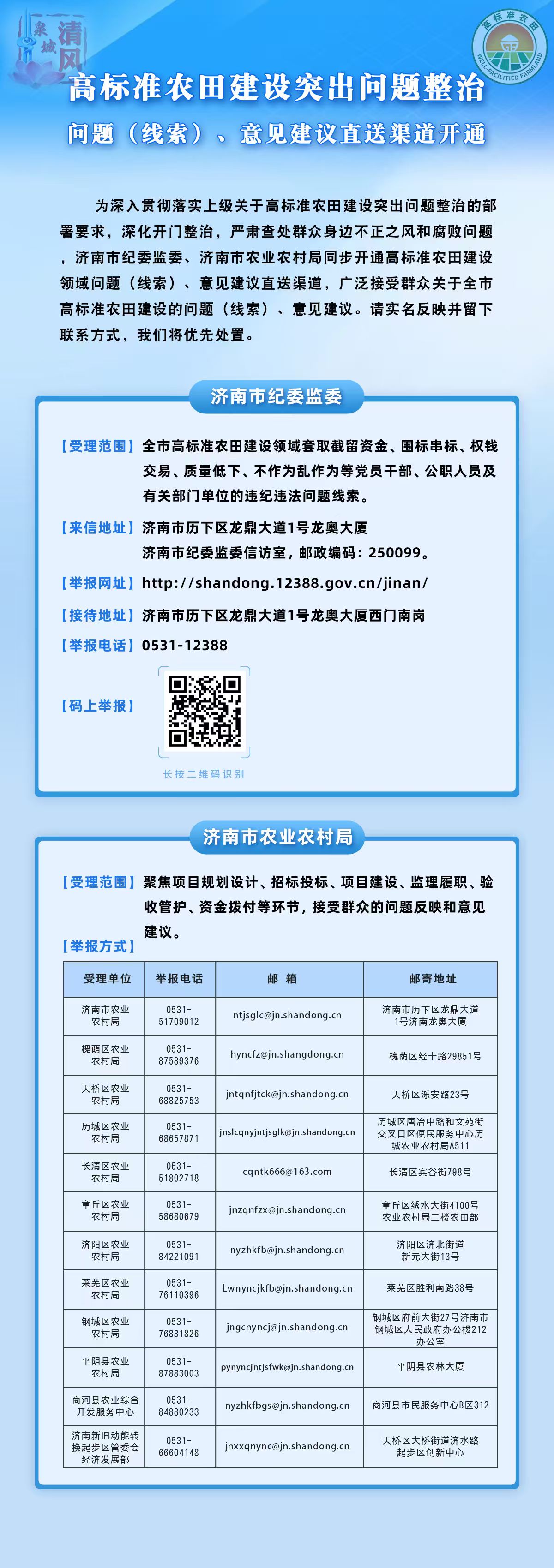 近日,济南市农业农村局发布《高标准农田建设突出问题整治问题(线索)、意见建议直送渠道开通》消息。
