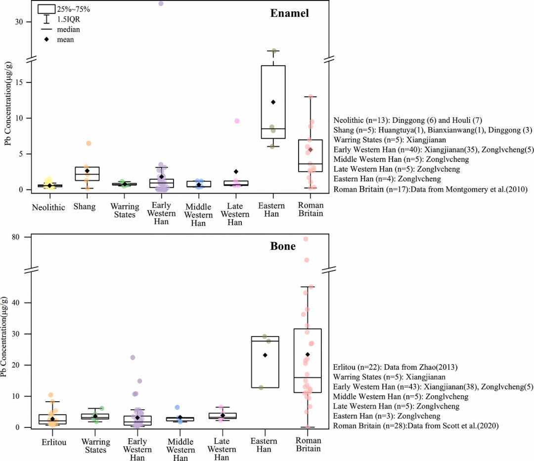 中国利用铅的历史也十分悠久,在夏商周时期就形成了东亚特色的青铜铸造加铅技术。湖泊沉积物研究显示金属开采与冶炼造成了显著的重金属环境污染,但中国古代人类铅暴露史鲜有研究。