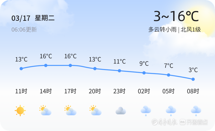 今天是3月17日,星期二,农历正月廿九。滨州天气多云转小雨,当前温度1.8℃,北风1级,空气湿度91%。PM2.5指数为127,空气质量为轻度污染。市民出行请注意携带雨具,雨天路滑,驾车请减速慢行,同时建议佩戴口罩,做好健康防护。
