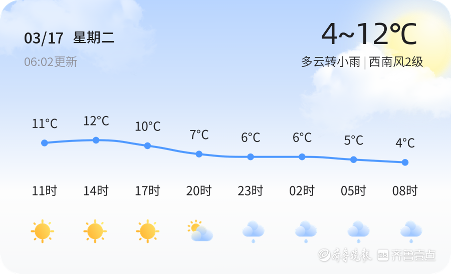 今天是3月17日,农历正月廿九,烟台市天气多云转小雨,气温在4℃到12℃之间,西南风2级,空气湿度39%,PM2.5指数80。各区天气情况基本一致,市民出行需注意携带雨具,及时添衣保暖。