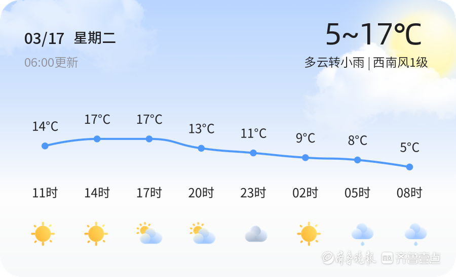 今日是3月17日,星期二,农历正月廿九。淄博市迎来多云转小雨天气,气温在5℃至17℃之间波动。全市各区均出现不同程度的小雨天气,西南风1级,空气湿度较高,PM2.5指数为133,空气质量良好。市民外出时请注意携带雨具,及时增添衣物以应对气温变化。