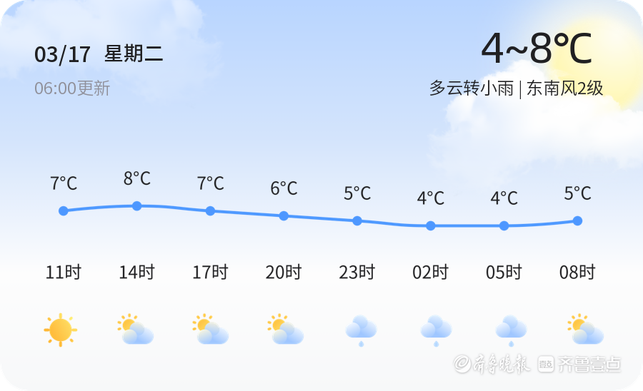 今天是3月17日,正月廿九,青岛市迎来多云转小雨的天气。当前气温为4.9℃,东南风2级,空气湿度为85%,空气质量指数为64,属于良好。市民朋友们在出行时请注意携带雨具,并注意交通安全。今天的最高气温预计将达到8℃,最低气温为4℃,温差较大,建议市民适时增减衣物。此外,青岛市部分地区出现大雾天气,能见度较低,提醒司机朋友减速慢行,确保行车安全。