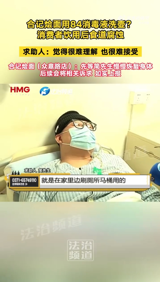 “现在胃和食道还觉得疼,吃东西以流食和半流食为主,吞咽馒头这种会有困难。”在简先生的讲述里,由于在郑州合记烩面众意路店用餐期间喝到了含有84消毒液的水,他过去三个月一度瘦了30斤。