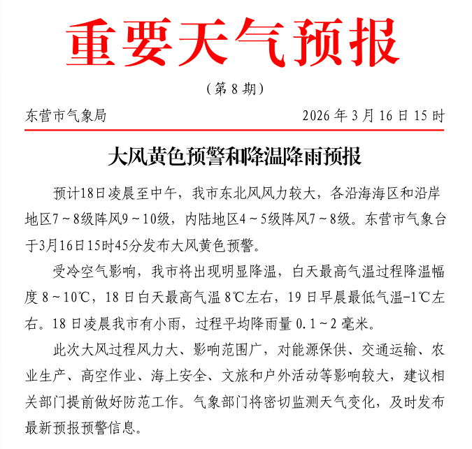 16日,东营市气象局发布了大风黄色预警和降温降雨预报:预计18日凌晨至中午,东营市东北风风力较大,各沿海海区和沿岸地区7~8级阵风9~10级,内陆地区4~5级阵风7~8级。