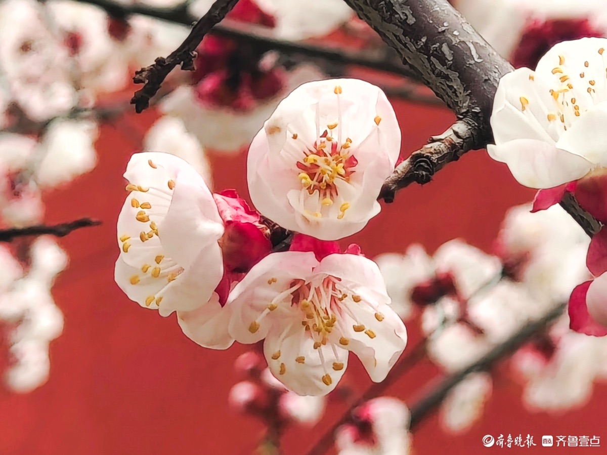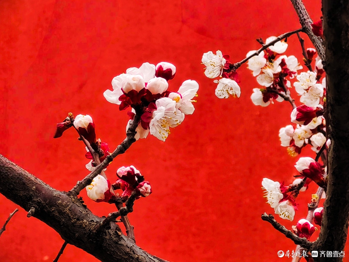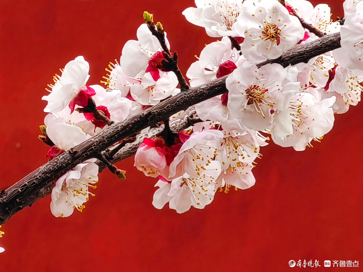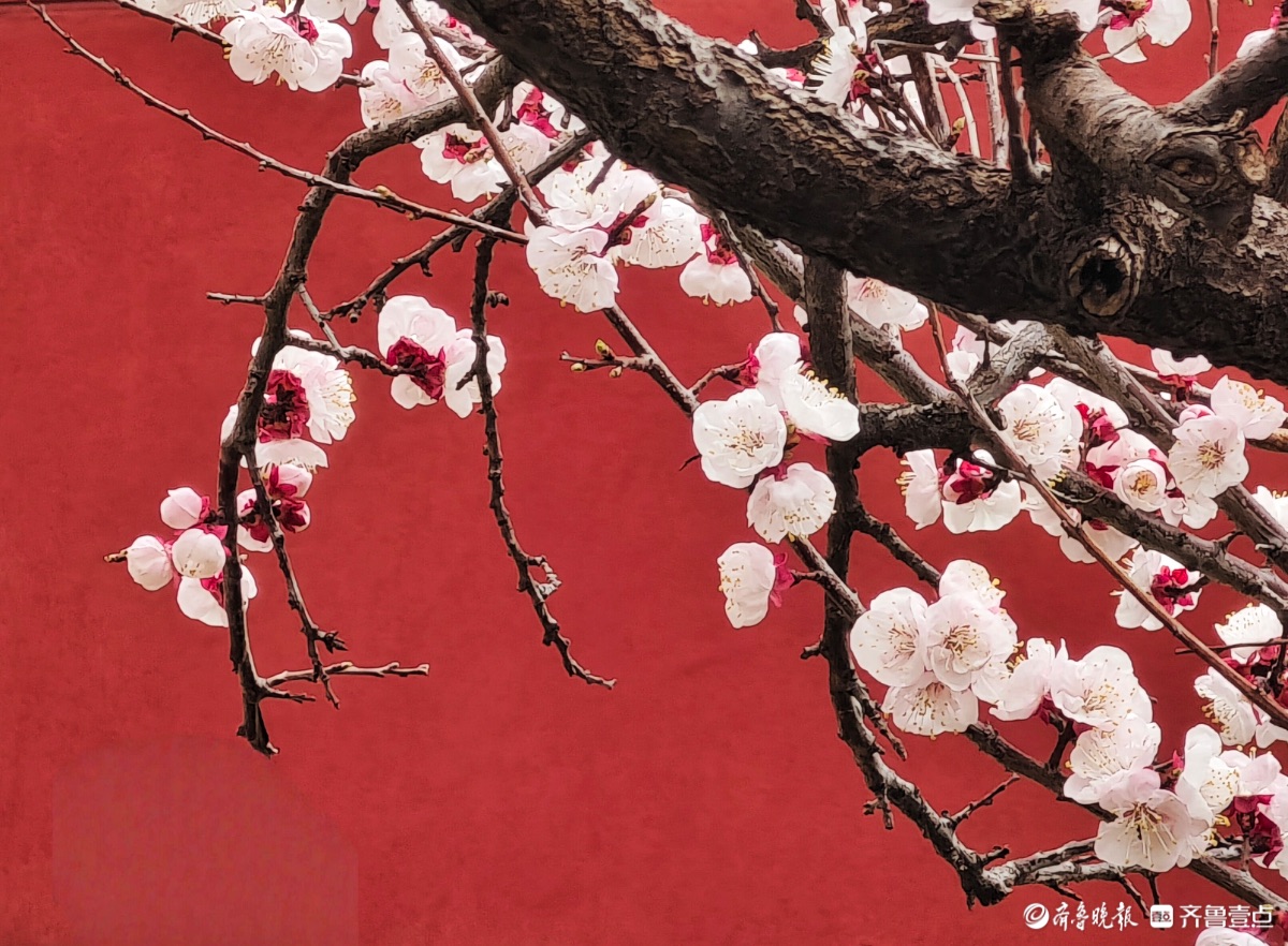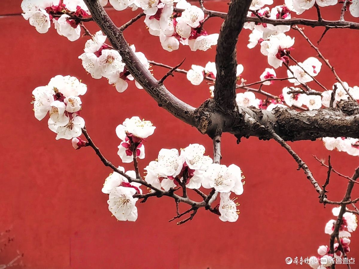 3月15日,春和景明。在临沂市沂河新区的一个小区里,一株株杏树绽放出粉嫩的花朵,粉红杏花与红色墙面相遇,二者相互映衬,画面美到极致。高军摄