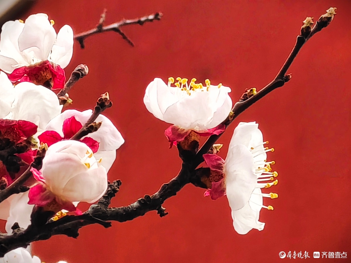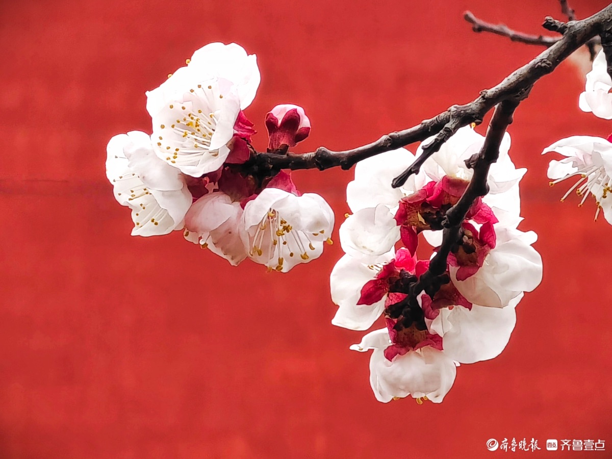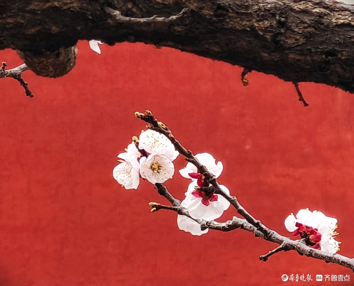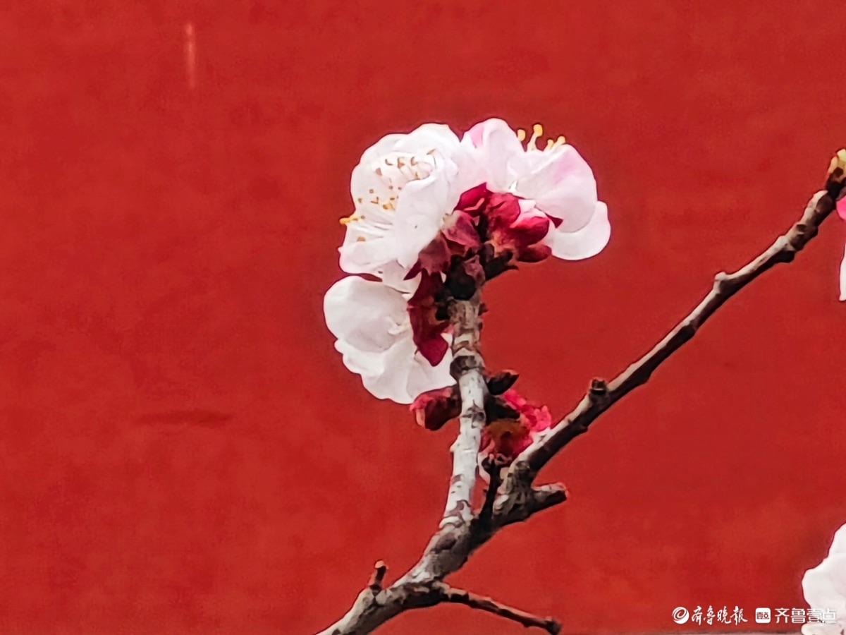 3月15日,春和景明。在临沂市沂河新区的一个小区里,一株株杏树绽放出粉嫩的花朵,粉红杏花与红色墙面相遇,二者相互映衬,画面美到极致。高军摄