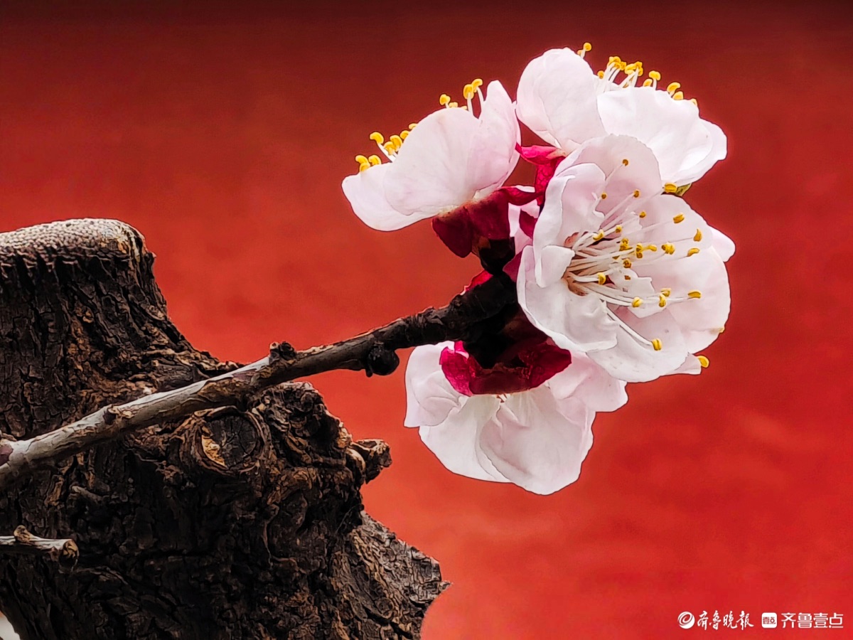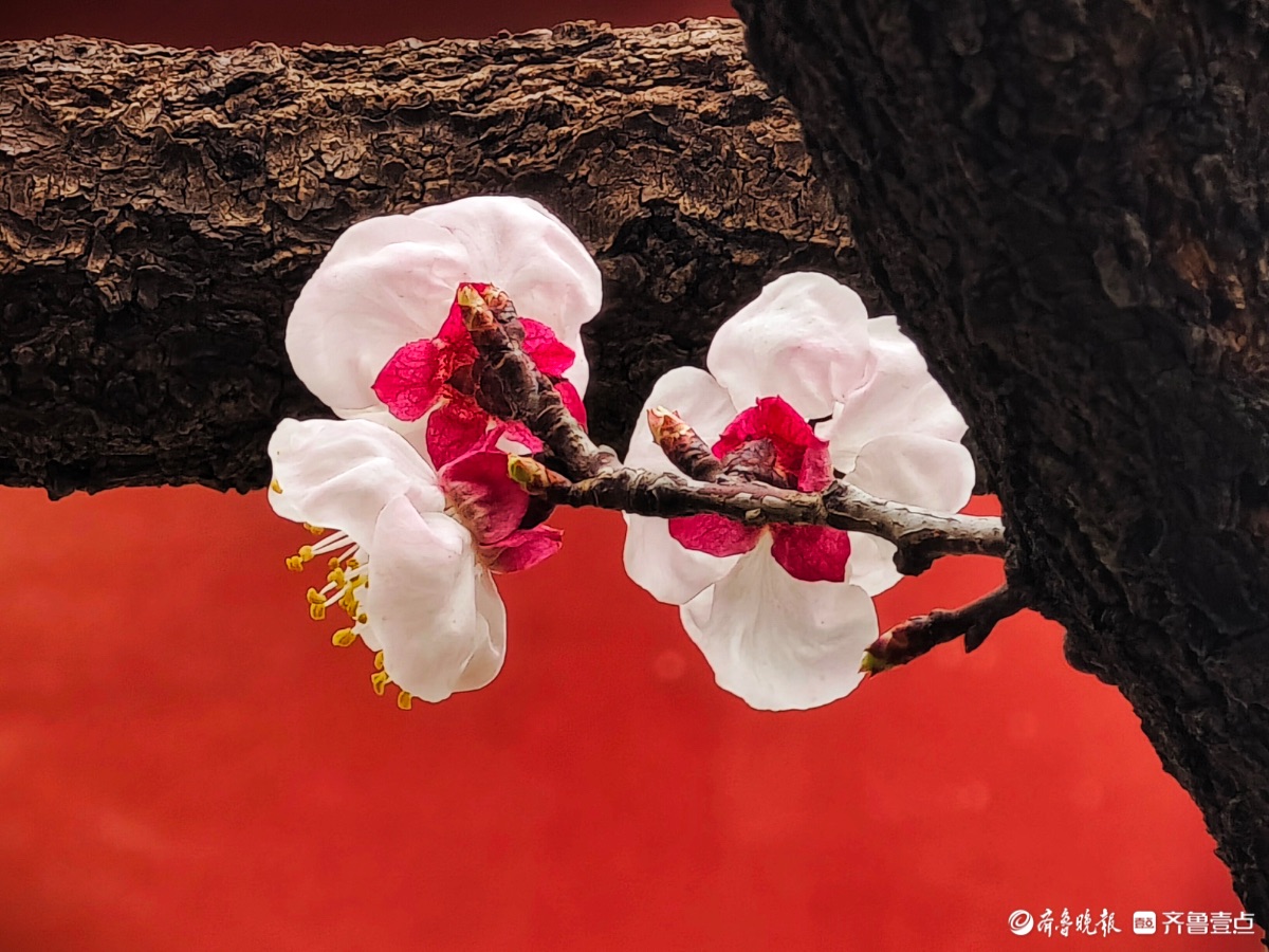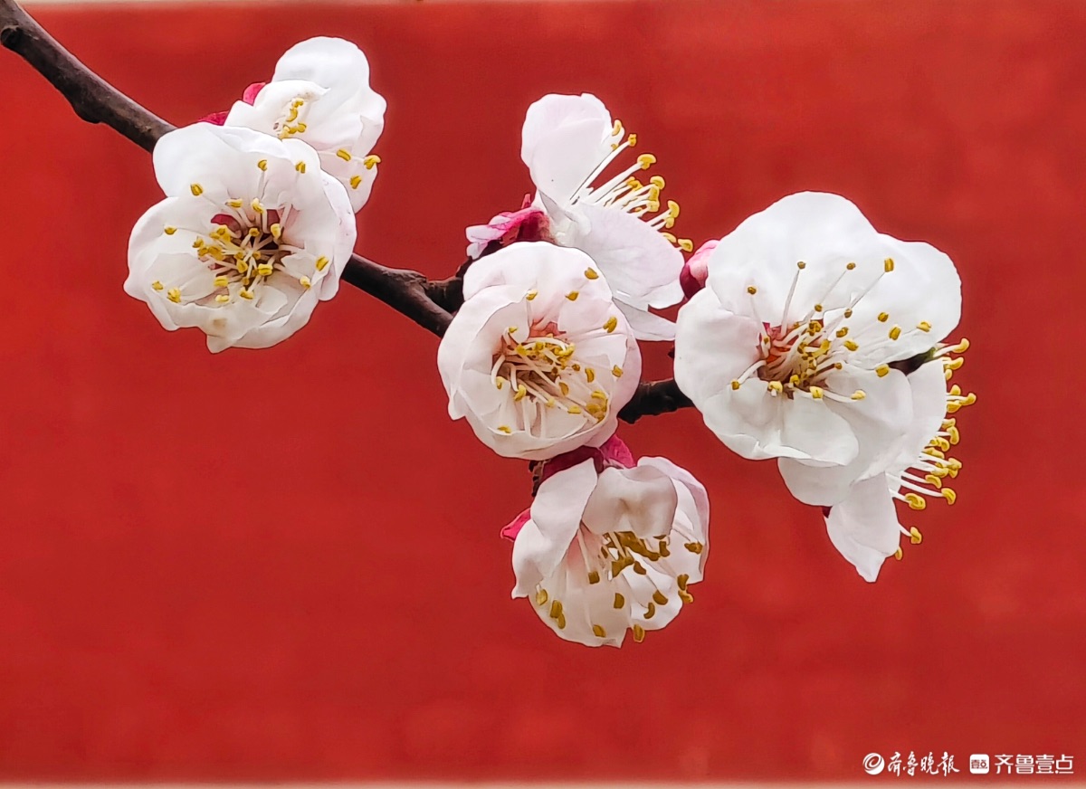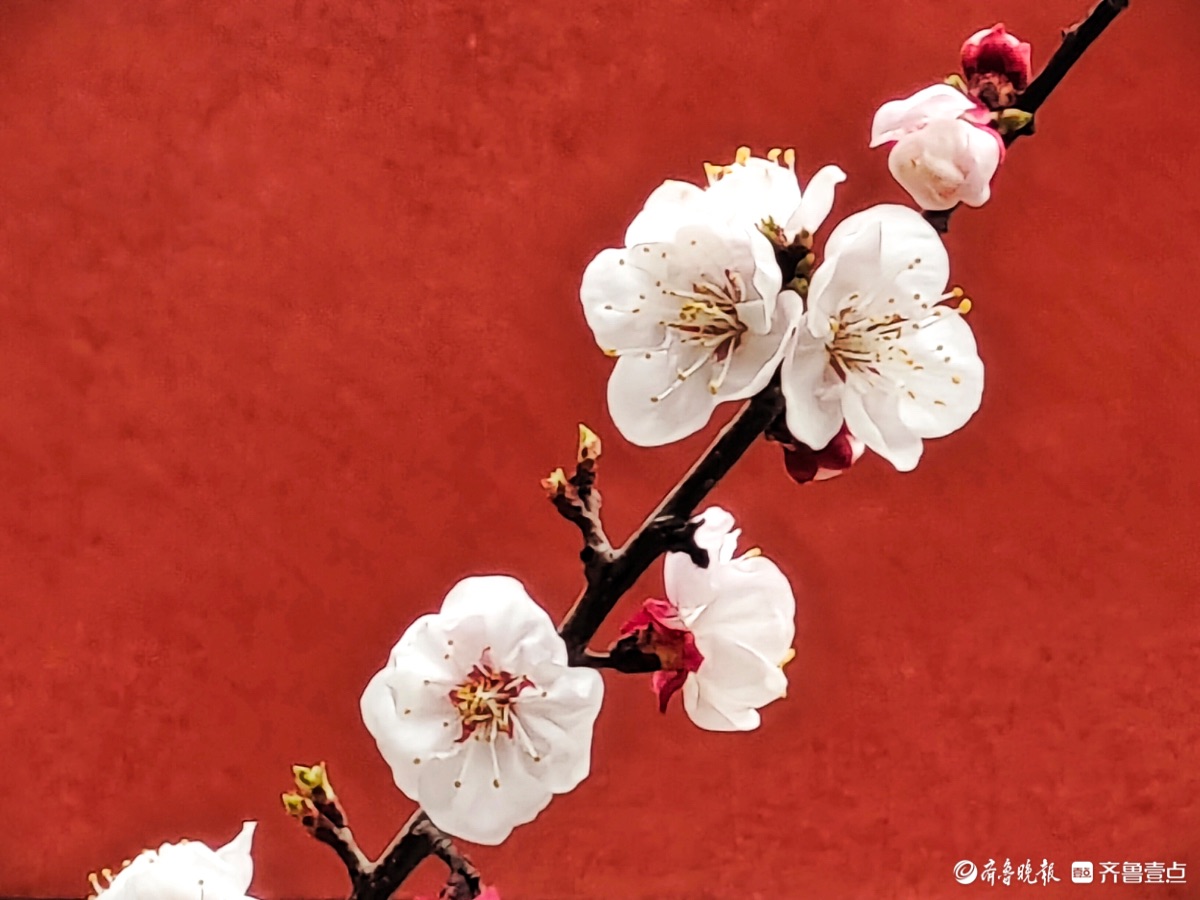 3月15日,春和景明。在临沂市沂河新区的一个小区里,一株株杏树绽放出粉嫩的花朵,粉红杏花与红色墙面相遇,二者相互映衬,画面美到极致。高军摄