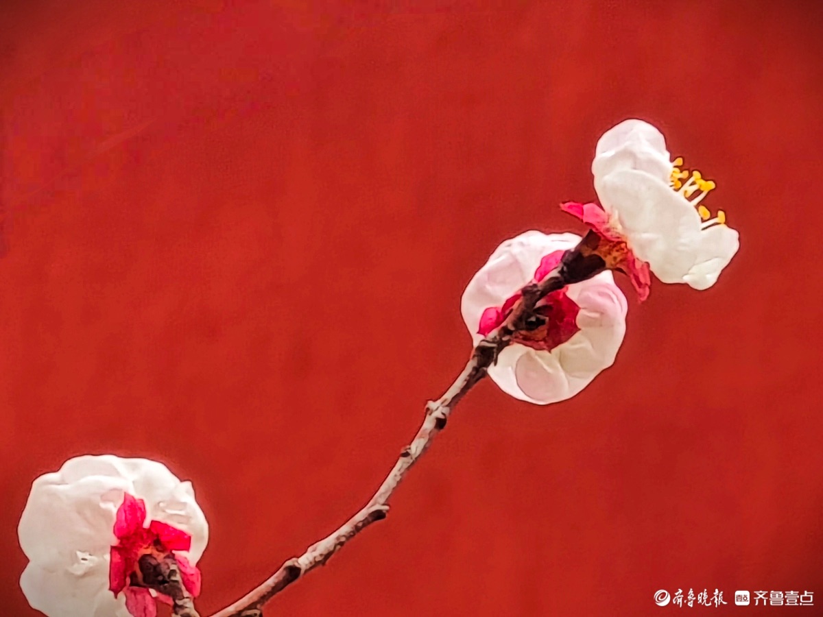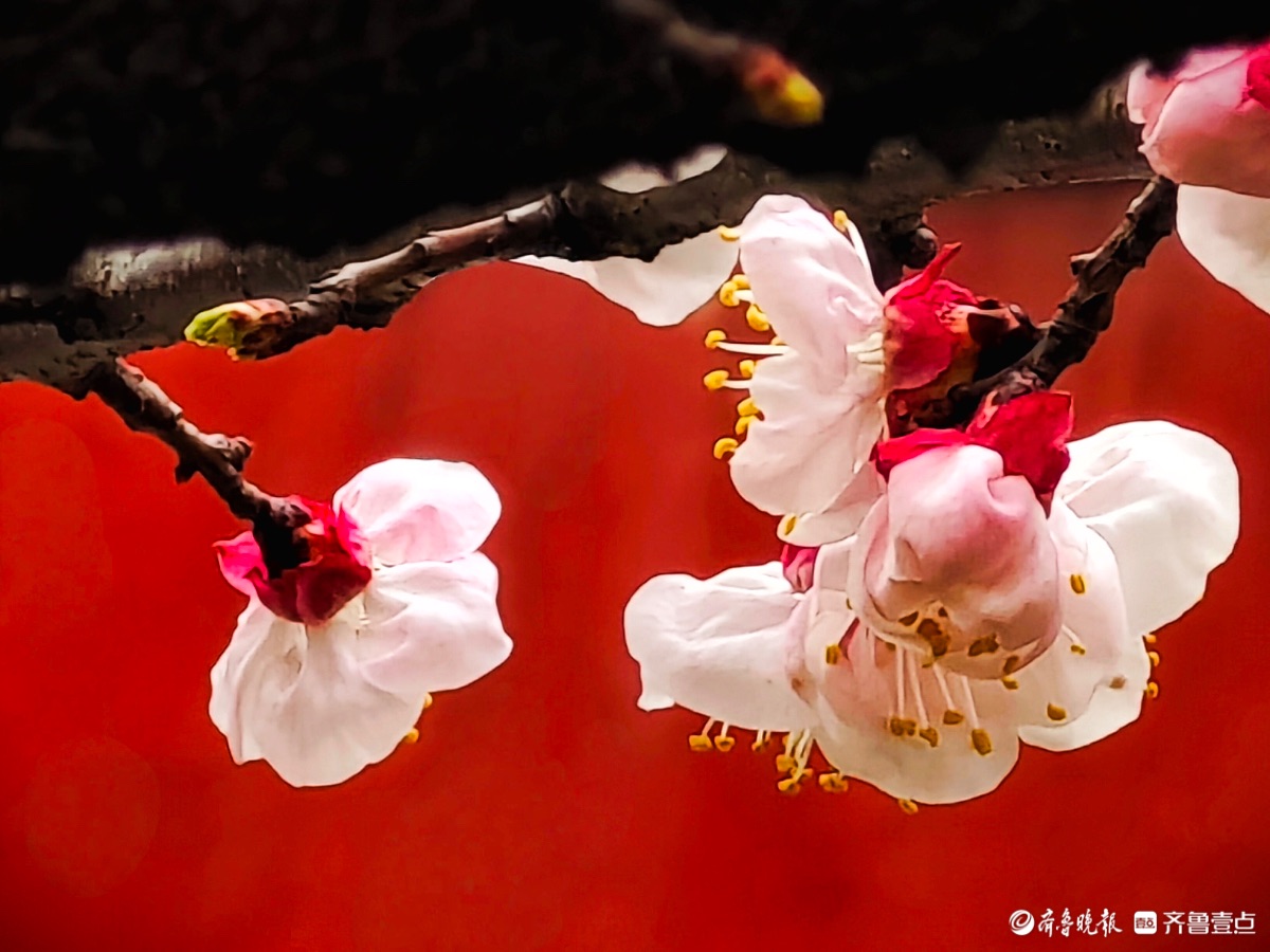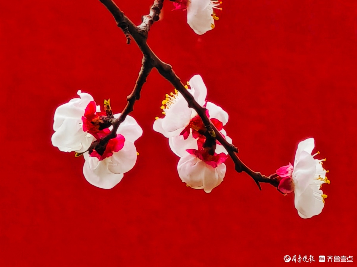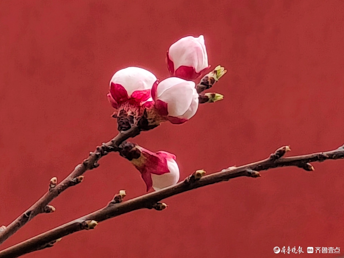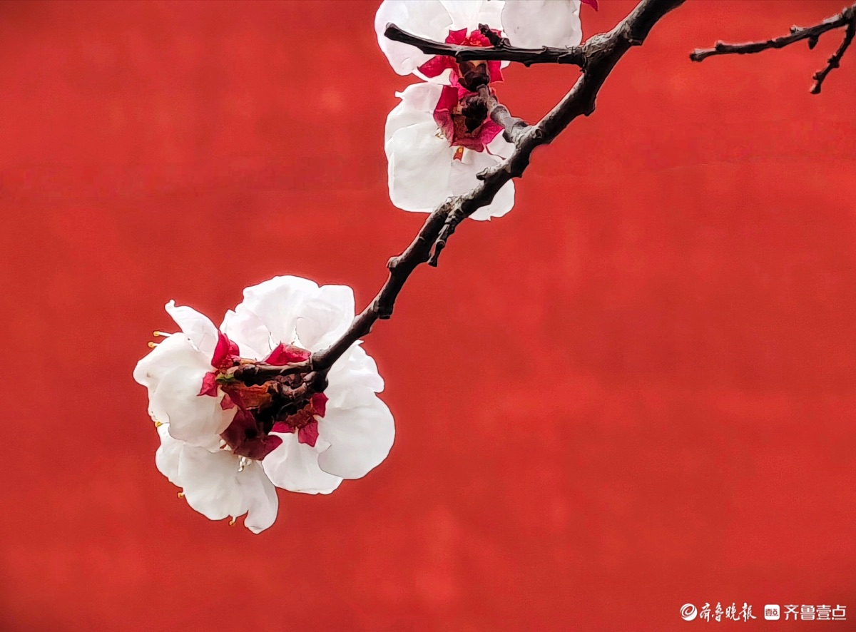 3月15日,春和景明。在临沂市沂河新区的一个小区里,一株株杏树绽放出粉嫩的花朵,粉红杏花与红色墙面相遇,二者相互映衬,画面美到极致。高军摄