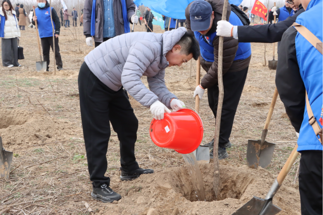 黄河之水天上来,奔流到海不复回。作为黄河流域唯一河海交汇区的山东,正肩负着下游生态保护主战场的重任。植树造林,不仅是守护黄河安澜的硬核举措,更是践行“双碳”目标、写好绿色金融大文章的生动实践。活动现场,志愿者们分工协作,扶苗、培土、浇灌,每一个步骤都细致入微。春风拂过,一株株新栽的树苗迎风挺立,不仅为黄河沿岸的生态屏障增添了新的生机,也象征着绿色希望在齐鲁大地深深扎根。