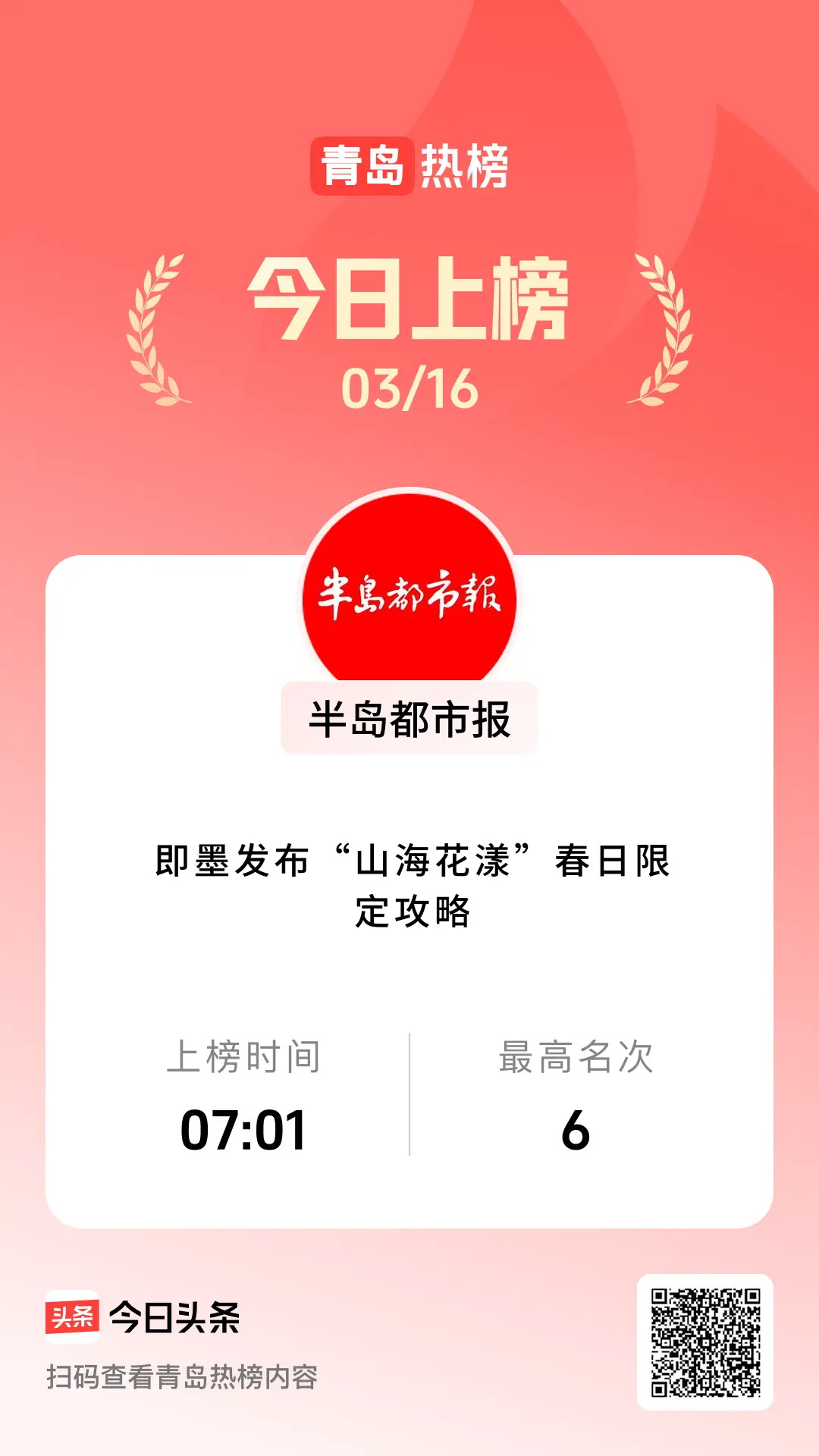 登上青岛热榜,最高位次为第6名