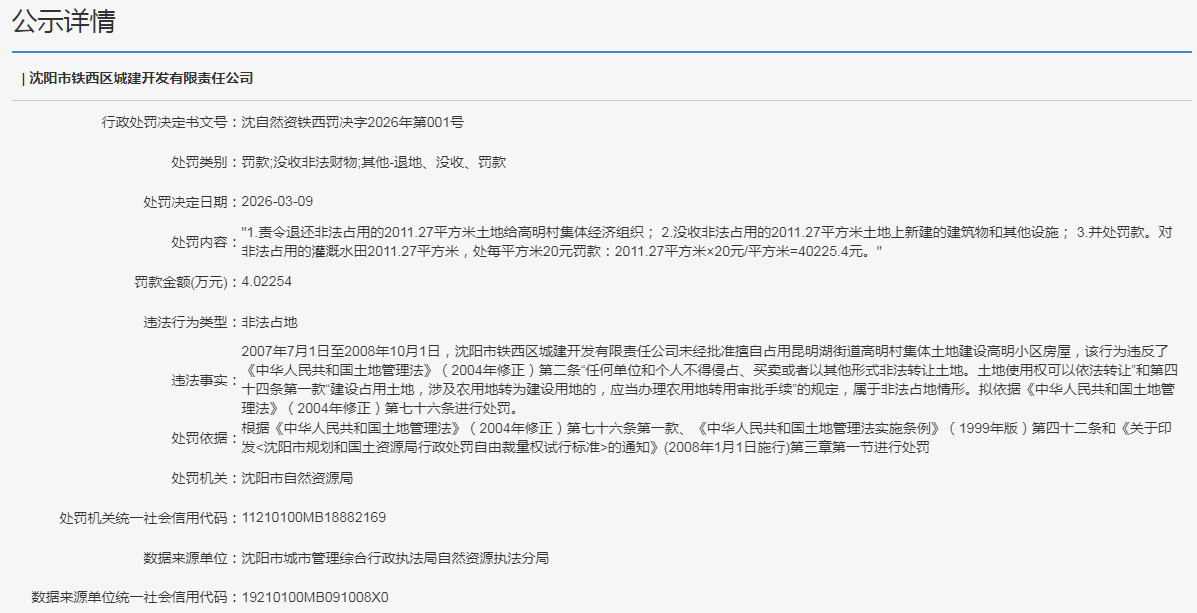 日前,信用中国(辽宁沈阳)公示了沈阳市铁西区城建开发有限责任公司的行政处罚决定。行政处罚决定书文号沈自然资铁西罚决字2026年第001号显示,2007年7月1日至2008年10月1日,沈阳市铁西区城建开发有限责任公司未经批准擅自占用昆明湖街道高明村集体土地建设高明小区房屋,该行为违反了《中华人民共和国土地管理法》(2004年修正)第二条“任何单位和个人不得侵占、买卖或者以其他形式非法转让土地。土地使用权可以依法转让”和第四十四条第一款“建设占用土地,涉及农用地转为建设用地的,应当办理农用地转用审批手续”的规定,属于非法占地情形。