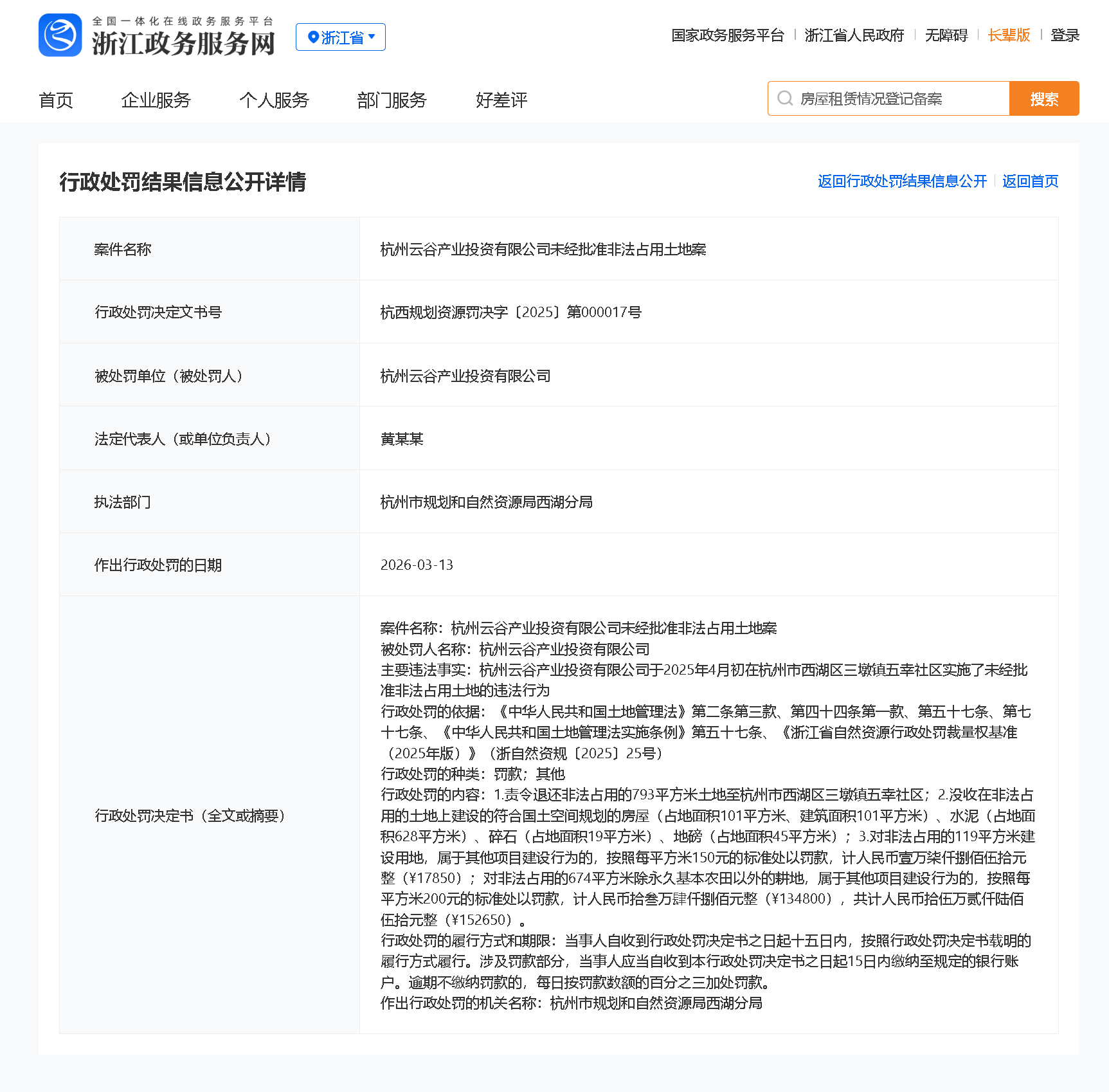 2026年3月13日,齐鲁晚报·齐鲁壹点记者从浙江政务服务网获悉,杭州云谷产业投资有限公司因未经批准非法占用土地案,被杭州市规划和自然资源局西湖分局行政处罚。