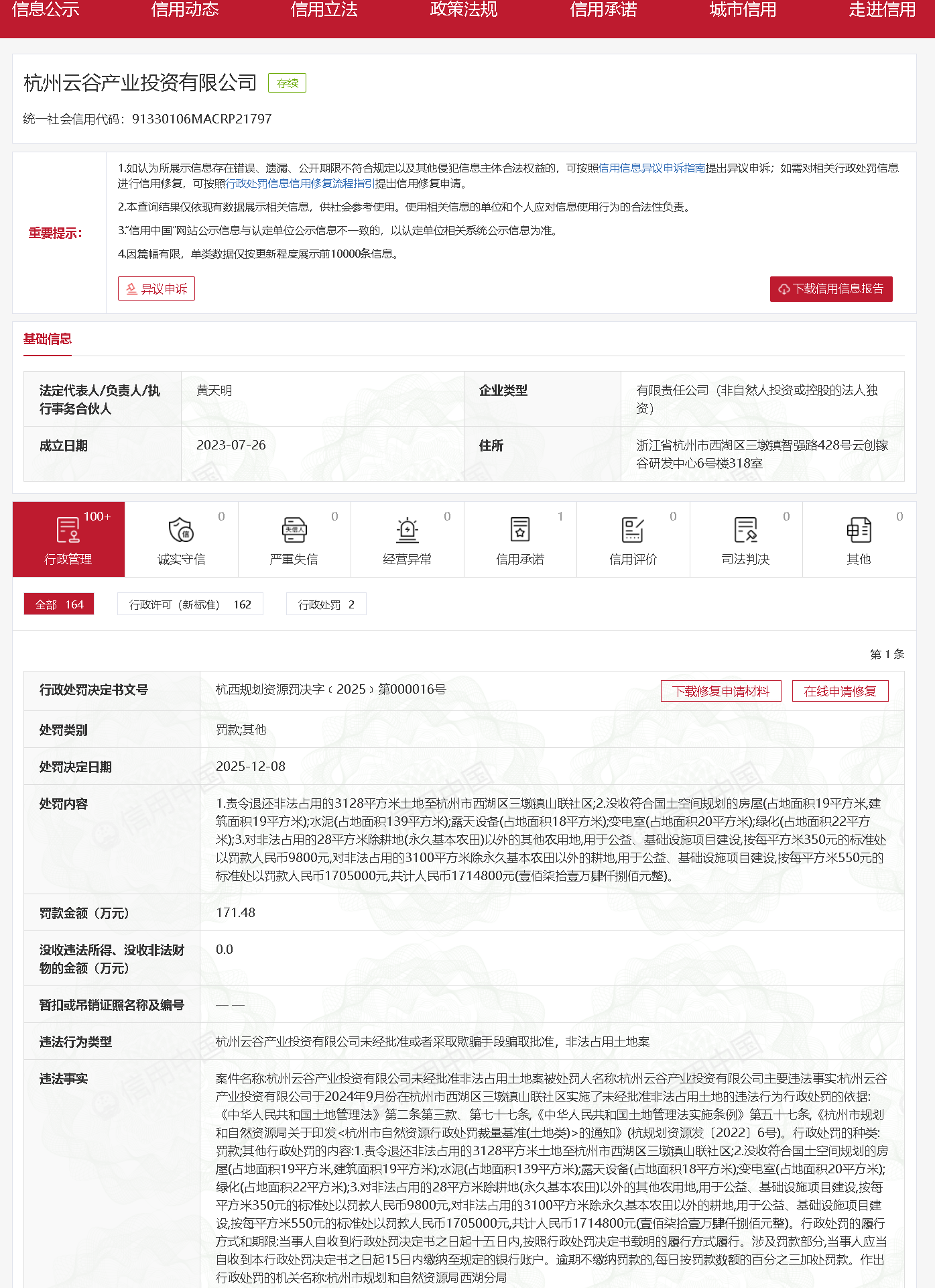这不是杭州云谷产业投资有限公司首次被政府处罚。信用中国显示,该公司在2025年12月8日曾因未经批准或者采取欺骗手段骗取批准,非法占用土地案,被杭州市规划和自然资源局西湖分局罚款171.48万元。