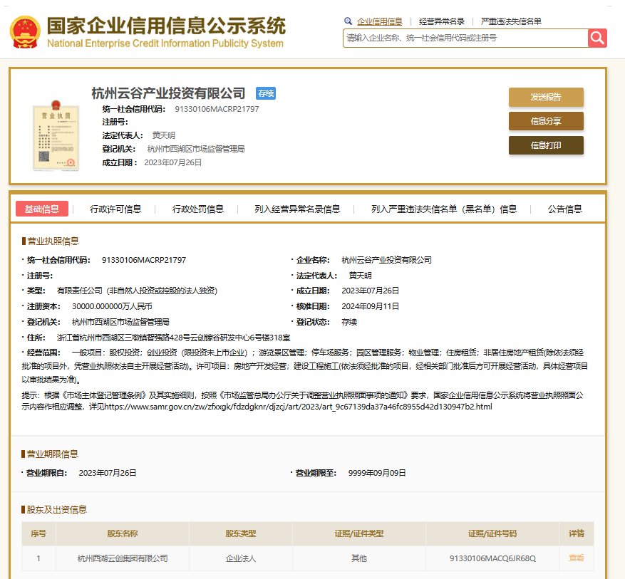 国家企业信用信息公示系统显示,杭州云谷产业投资有限公司成立于2023年7月26日,法定代表人黄天明,股东为杭州西湖云创集团有限公司,是杭州西湖投资集团旗下的公司。