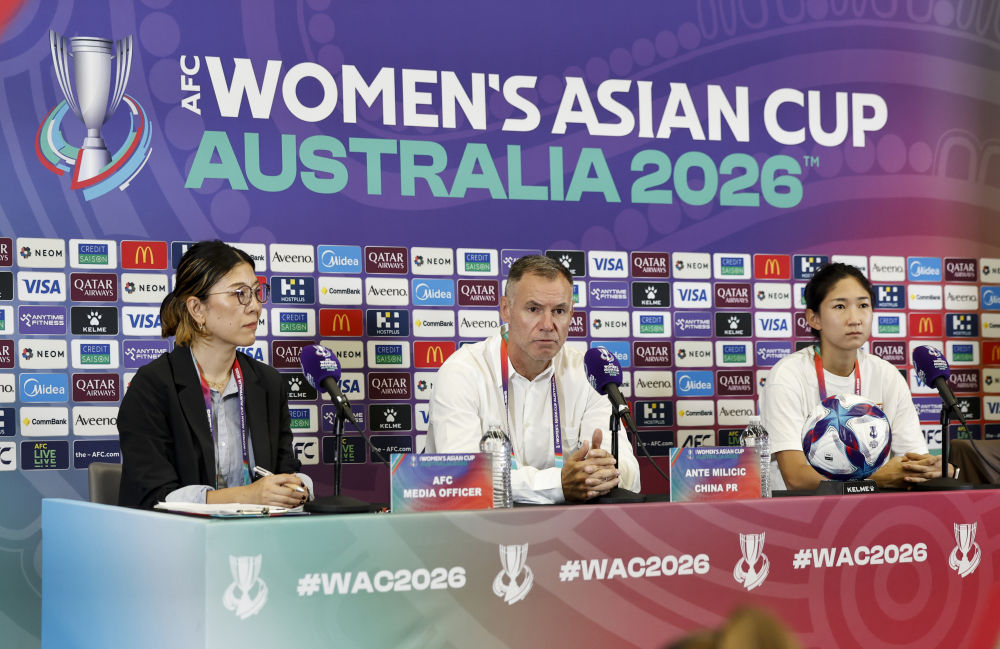 ↑3月16日,中国女足主教练米利西奇(中)和球员王妍雯(右)在新闻发布会上。新华社发(周丹摄)