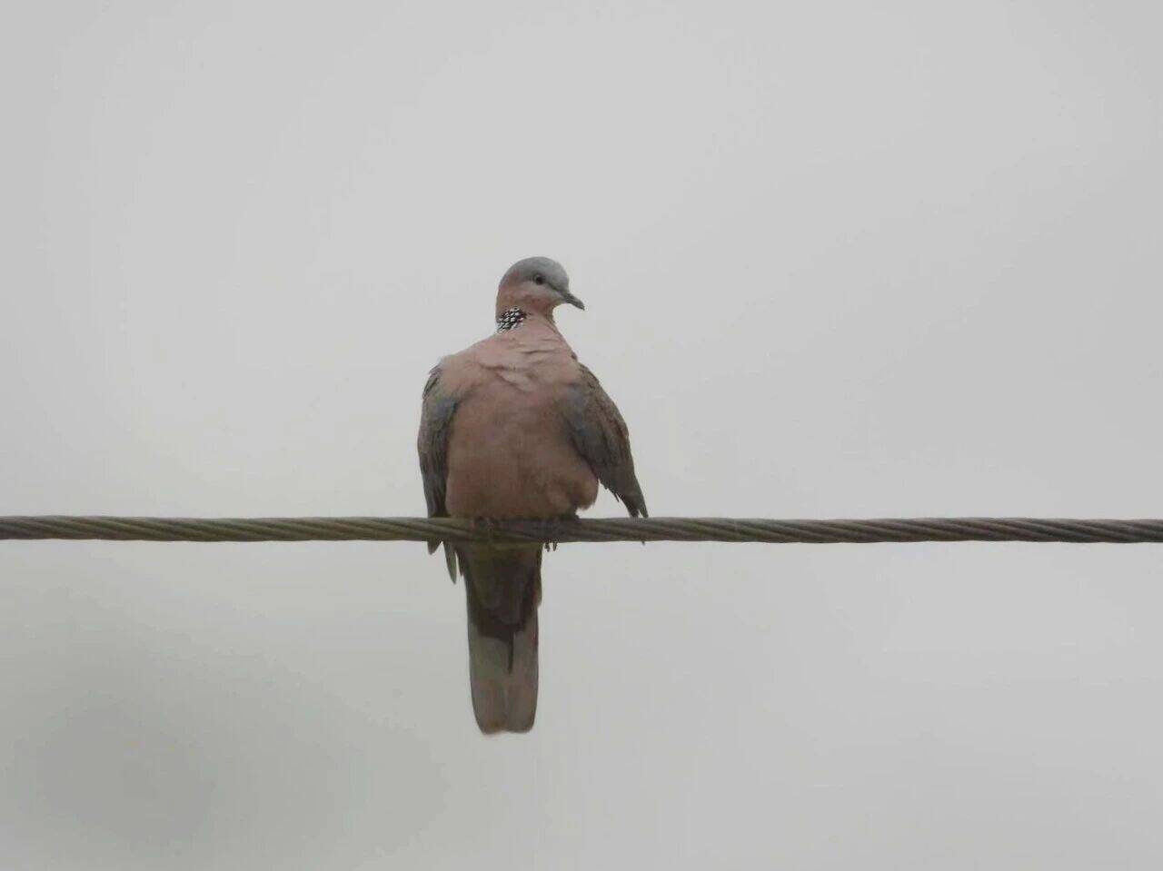 形态特征:珠颈斑鸠体型健硕,翅膀相对较短,尾部较长且宽大。全身呈棕色,胸部偏粉红,最显著的特征是颈后部有一块由黑白斑点组成的“项链”。成年鸟与幼鸟的主要区别在于幼鸟的颈斑不明显,且整体色泽更为暗淡。