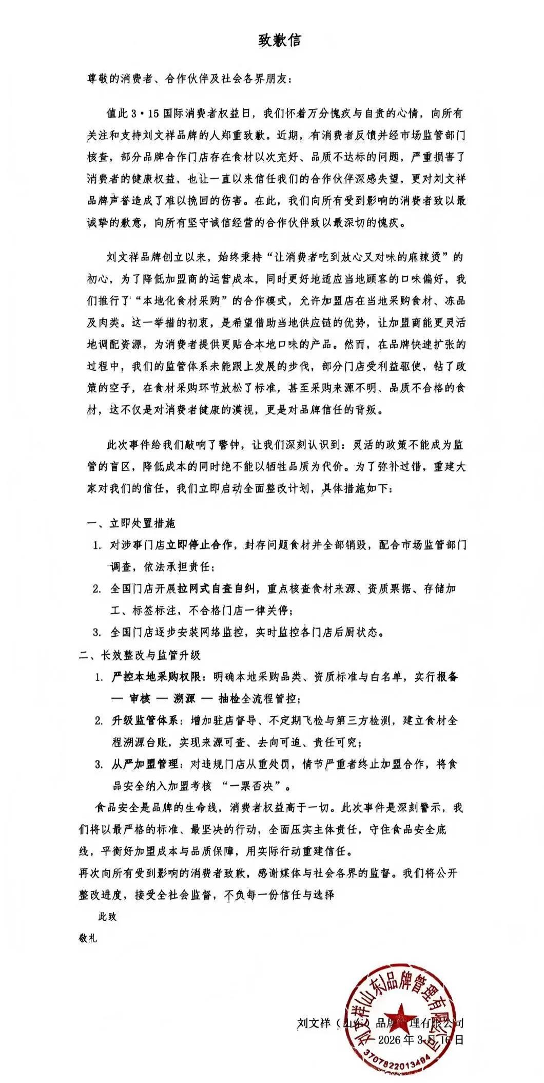刘文祥麻辣烫发布致歉信 整改措施能否治愈2800家门店?
