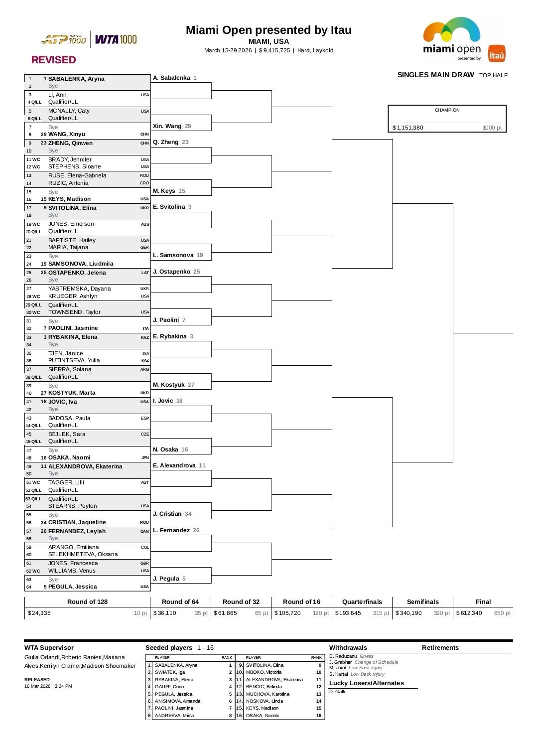 今天(17日),WTA1000迈阿密站最新签表公布,前八种子对位如下:[1]萨巴伦卡-[7]鲍里妮[3]莱巴金娜-[5]佩古拉[6]阿尼西莫娃-[4]高芙[8]米拉·安德列娃-[2]斯瓦泰克郑钦文、王欣瑜首轮轮空,张帅对阵科斯蒂亚。