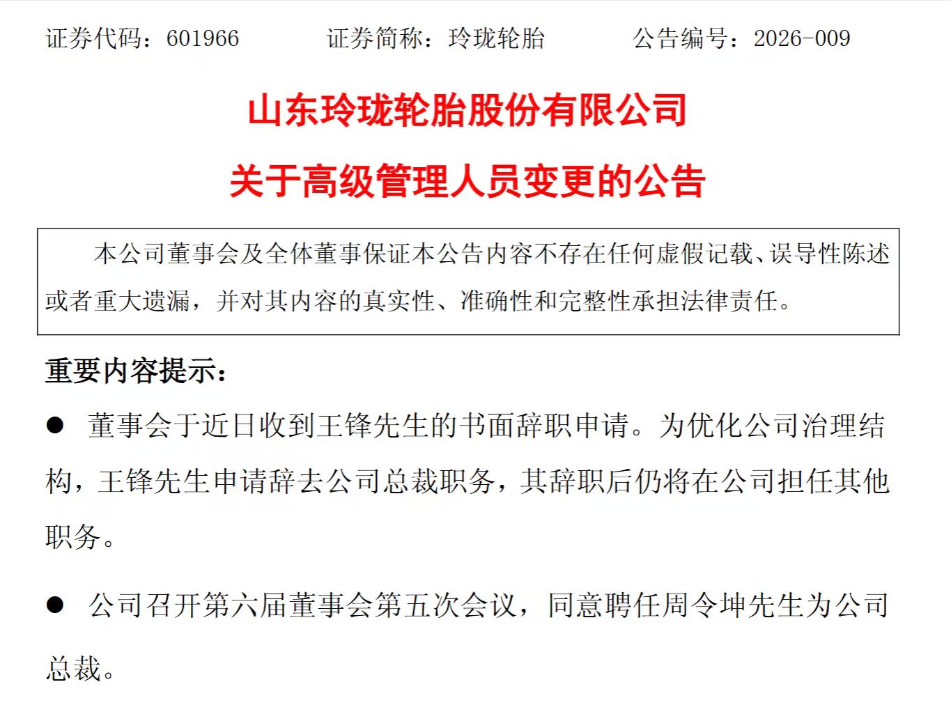 3月16日,玲珑轮胎(601966.SH)发布公告,为优化公司治理结构,王锋辞去总裁职务,但仍将继续担任公司董事长及其他职务。同时公司第六届董事会第五次会议决定,聘任周令坤为新任总裁。