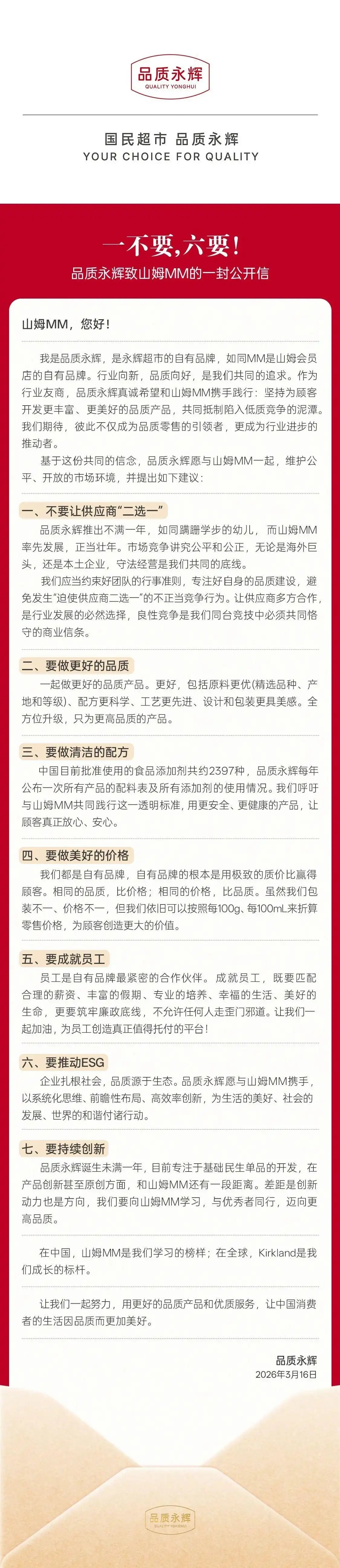 3月16日,记者获悉,永辉超市自有品牌“品质永辉”发布致山姆MM的一封公开信,提出“一不要,六要”。