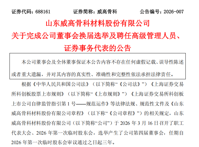 3月16日,山东威高骨科材料股份有限公司(688161.SH,下称“威高骨科”)发布公告称,顺利完成第四届董事会换届及高级管理人员聘任工作。本次换届后,公司董事长、总经理等关键岗位核心人员继续履职,独立董事团队全面更换。