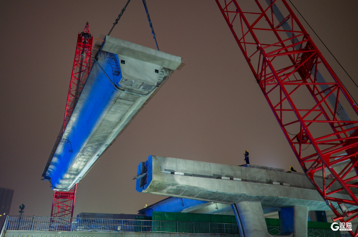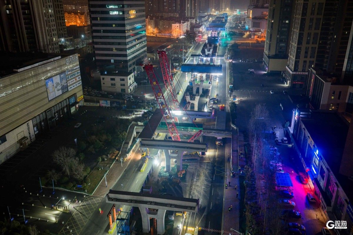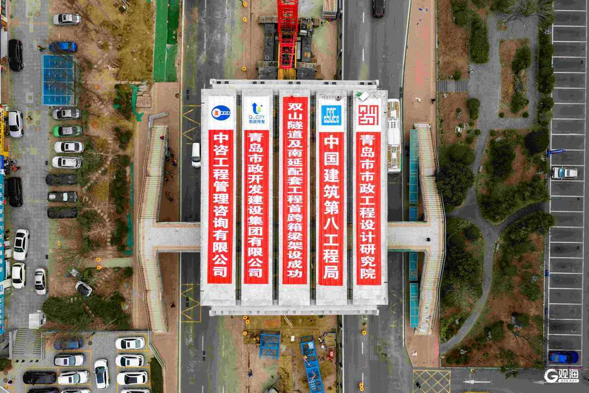 本次架设的预制小箱梁长约30米、重约200吨,架设点位于市内核心建成区,周边居住及商业区较为密集,且施工还需上跨既有人行天桥,对交通疏导组织、吊装作业精度和施工安全管控等方面均提出严苛挑战。青岛市政开发建设集团锚定全市“干部作风建设年”活动要求,深入践行“实、新、快、严”工作作风,将作风锤炼融入建设管理全链条,在住建、交警等有关部门的指导帮助下,针对性制定箱梁架设“一方案、一清单、一验收”管理制度和“一跨一方案”管控要求。协同施工单位中建八局,多次开展现场踏勘,对箱梁运输线路、起吊参数、架设流程等全环节反复模拟推演,对施工人员配备、起重机械状态、安全防护措施等进行逐项核查验收。施工过程中,各岗位人员高效联动、密切配合,强化吊装工序衔接组织与全程安全管控,确保首跨小箱梁架设一次成优,为后续大规模、标准化架梁作业打造了可复制、可推广的施工样板。