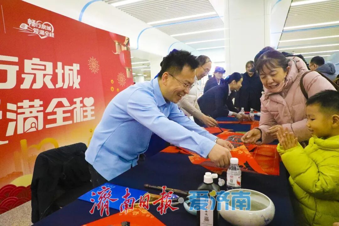 春节临近,山东博物馆站、青年政治学院站开展“新春送福字”活动,书法爱好者挥毫泼墨,春联和福字带着墨香与祝福送到乘客手中。春节期间,泉城公园站里的流光溢彩心愿树,吸引乘客争相打卡拍照;转山西路(万象城)站与清源大街站上演“新春乐游会”,传统民俗体验轮番上阵,泉城的浓浓年味在车站和车厢里蔓延。