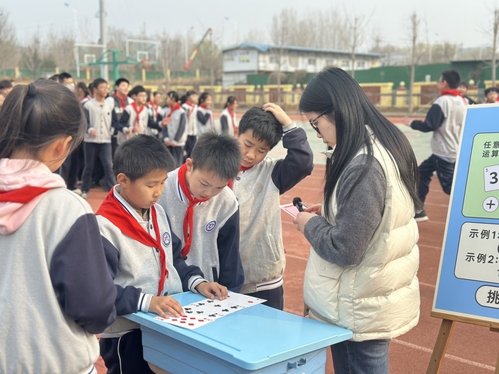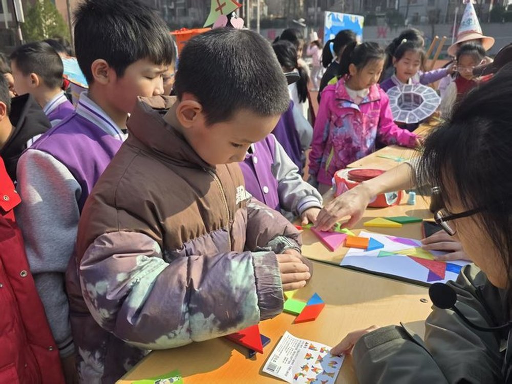 3月16日下午,高新区劝学里小学以“数趣童行,智启未来”为主题,将操场及各年级教室打造成六大闯关赛场,全校学生全员参与。一年级“七巧板拼图赛”中,孩子们灵巧翻转板块,拼出房子、小动物等生动图形;二年级“身体做指针描绘时间”环节,孩子们躺在地贴钟表上,张开双臂模拟时针分针,在欢笑中读懂时间的秘密;三至六年级则分别开展口算冲关、24点大作战、摆正方体、汉诺塔挑战等活动,覆盖计算、逻辑、空间思维等多个维度。活动现场秩序井然,教师全程引导评判,安全保障到位,学生参与率达100%,超过90%的孩子收获两枚及以上勋章。“原来数学可以这么好玩!”不少孩子意犹未尽地说道。