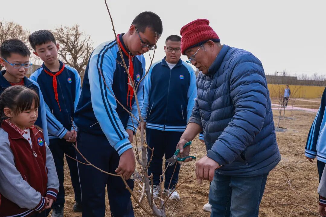 劳动教育是植树节活动的厚重底色。各校充分利用校内校外劳动实践基地,引导学生在种植、养护、管护中体验劳动的艰辛与快乐,锤炼意志品质。文登开发区小学开展“小菜园整理”劳动实践活动,同学们在老师带领下清理枯草、松土翻地,为后续种植做好准备,在农耕体验中提升观察能力与劳动技能。文登区侯家学校邀请果农现场传授剪枝技巧,引导学生掌握科学护绿方法;师生共同为树木浇水养护,并巧用针筒为树木除治蛀木虫,将劳动实践与精细管护相结合。荣成市第三十二中学依托“永怀桃李园”,为各班划定专属“永怀责任田”,在劳动老师指导下学习松土、剪枝、施肥、浇水等技能,并同步开展“植绿护绿”诗文原创与写生大赛,将劳动体验转化为艺术表达,深化生态认知。荣成市第三十八中学的老师指导学生选取无花果枝条进行扦插,让学生在实践中了解植物繁殖的奥秘。高区一中创新开展“泡沫箱微农场”种植活动,以班级为单位利用泡沫箱进行花草、蔬菜种植,让学生在亲手栽种、日常养护中感知生命成长。经区新都小学发挥党员教师引领作用,带领少先队员认领“责任绿植”,浇水、清理杂草,用汗水浇灌成长希望。