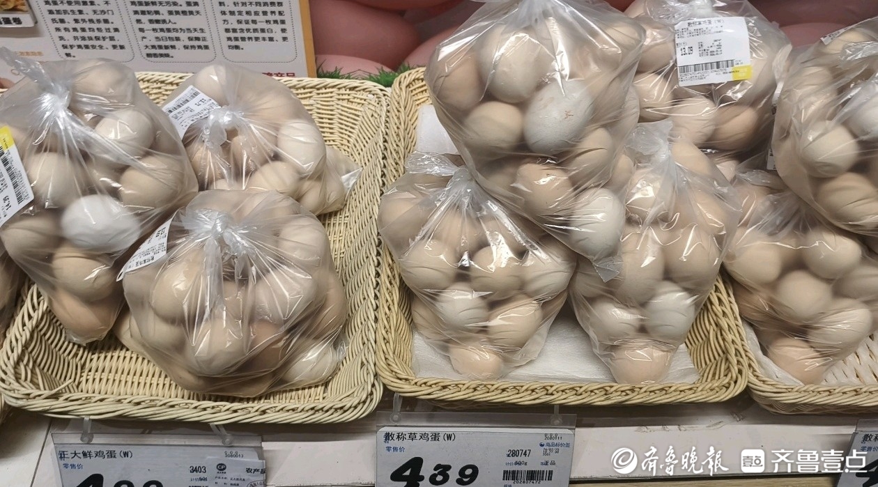 在历下区某大型商超生鲜区,散装新鲜鸡蛋 3.25 元 / 斤,单枚约 0.4 元;黄天鹅可生食鸡蛋 15 枚装 39.8 元,单枚 2.65 元,价格是前者的6倍多;同价位还有宣称减 60% 胆固醇的营养蛋,单枚 2.68 元。另外,各品牌的富硒蛋、可生食蛋、无抗初产蛋等功能蛋,单枚价在 0.875 元—1.99 元。在历城区一家连锁精品超市中,其自有品牌鸡蛋单价从 0.79 元到 2.99 元不等。