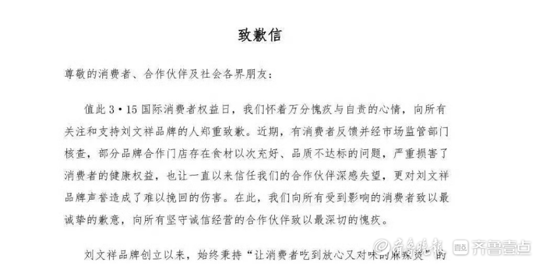 3月16日,针对多地“刘文祥麻辣烫”门店存在食材以次充好、品质不达标问题,刘文祥(山东)品牌管理有限公司发布致歉信。该品牌在致歉信中称,在品牌快速扩张的过程中,监管体系未能跟上发展的步伐,部分门店受利益驱使,钻了政策的空子,在食材采购环节放松了标准,甚至采购来源不明、品质不合格的食材。