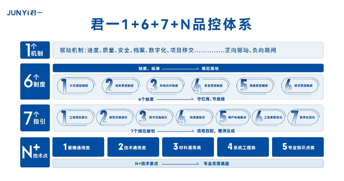 君一搭建了 "交付前 - 中 - 后" 全流程交付体系 ——"心交付 美好家"。该体系涉及设计、工程、营销、物业等多个部门,共计230余项管理动作和50余项指导书,从规划设计到工程建设,从销售服务到物业管理,每一个环节都严格把控,确保交付质量和交付体验让用户满意。