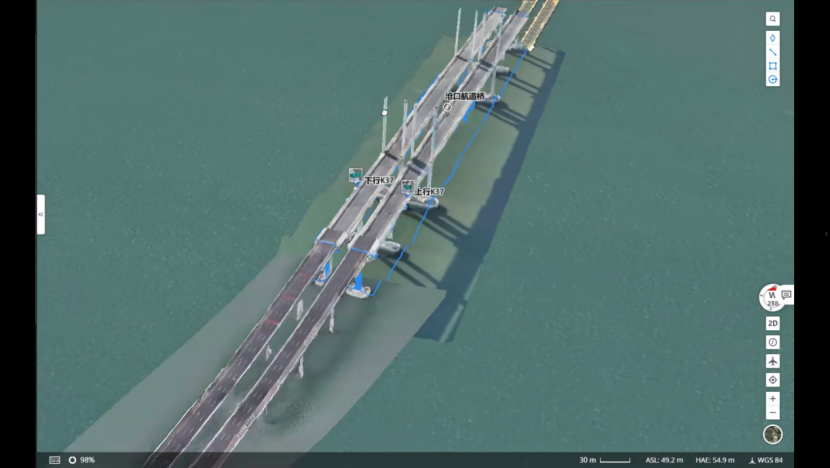 基于无人机采集的高精数据,系统已完成胶州湾大桥的实景三维建模,形成可视化的数字底板,为巡检路径规划与病害精准定位提供了底层数据支撑。