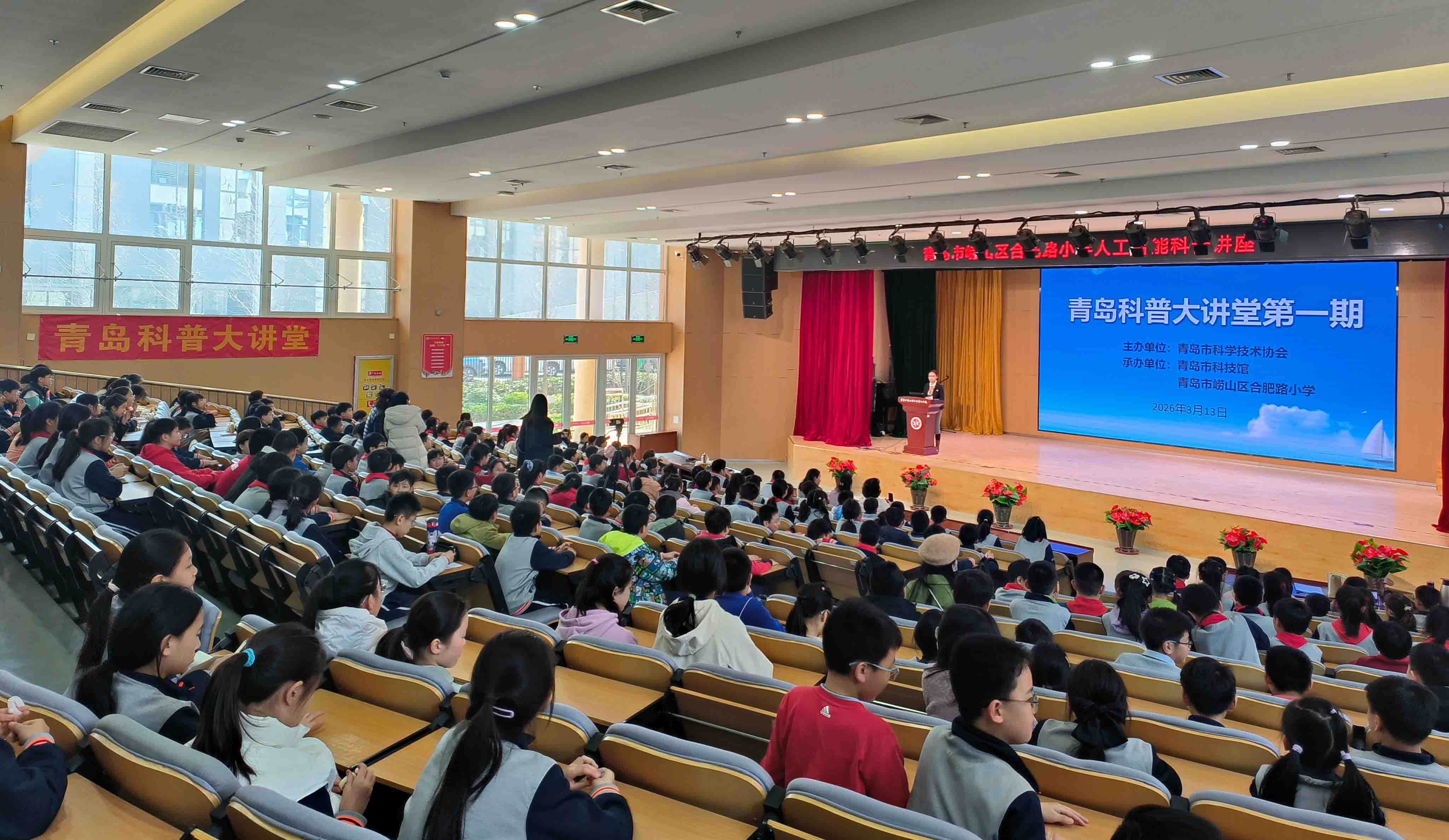 3月13日,2026年度首期青岛科普大讲堂在青岛合肥路小学成功举办。本次活动特邀青岛市蒲公英科普名家彭霞教授,以《AI是什么?AI就在我们身边!》为题,为学生们带来一场生动有趣的AI科普讲座。活动采取“现场+线上”相结合的形式,共有930名学生参与,其中400名学生现场聆听,530名学生通过线上平台收看。