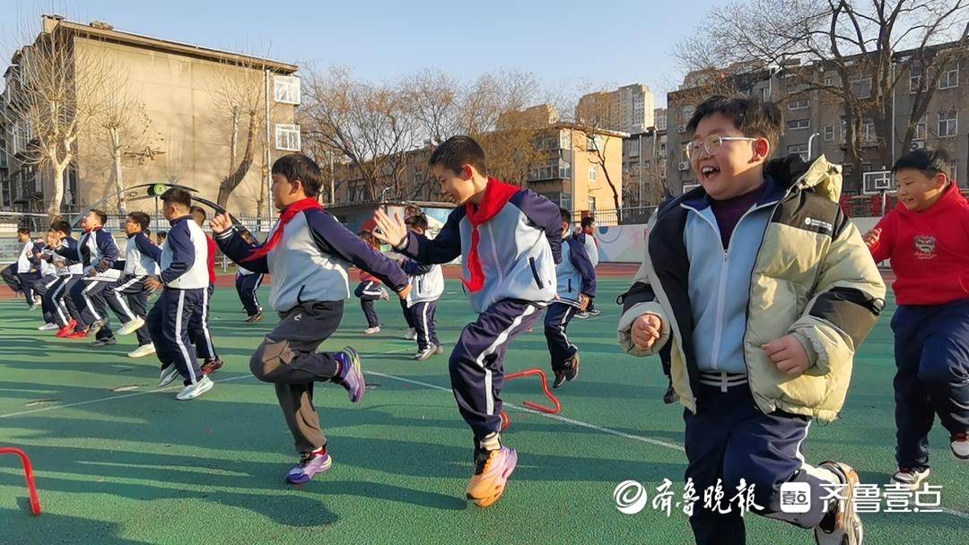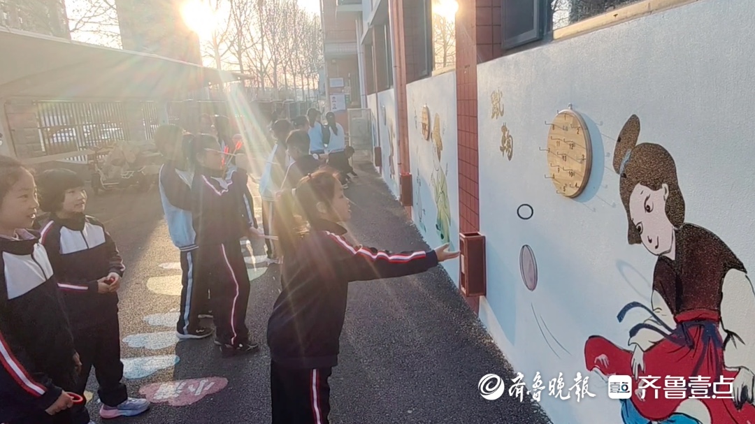 位于张店区的凯瑞小学,走廊里的墙壁上装着拳击靶,立柱上还挂着摸高器,校园里的空地上还画着跳房子和投壶。下课铃声一响,孩子们就冲出来,在这些好玩的设施面前排长队。