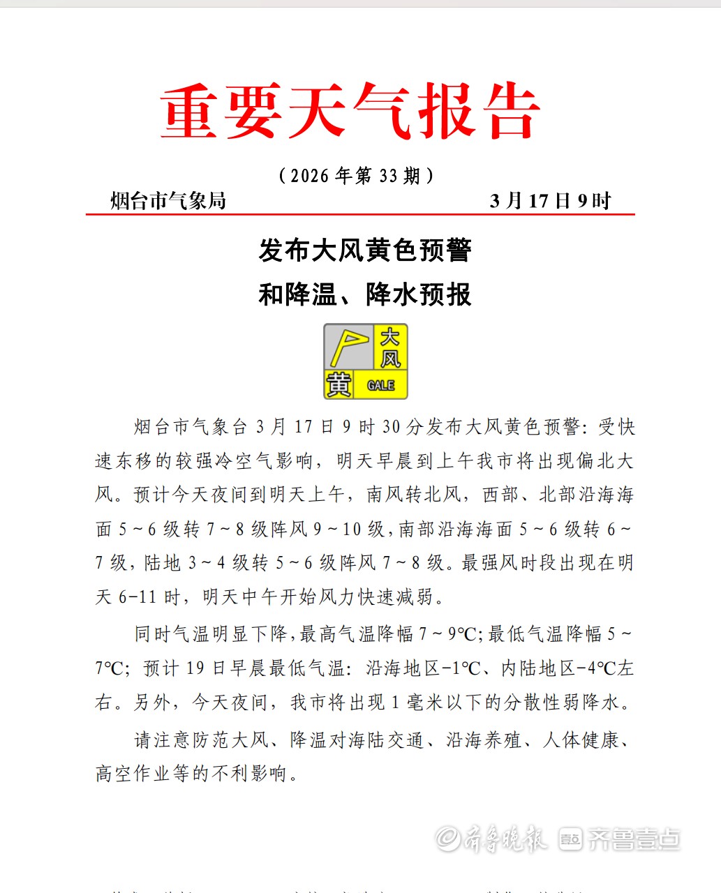 较强冷空气来袭,最低气温降幅5到7℃!烟台发布大风黄色预警