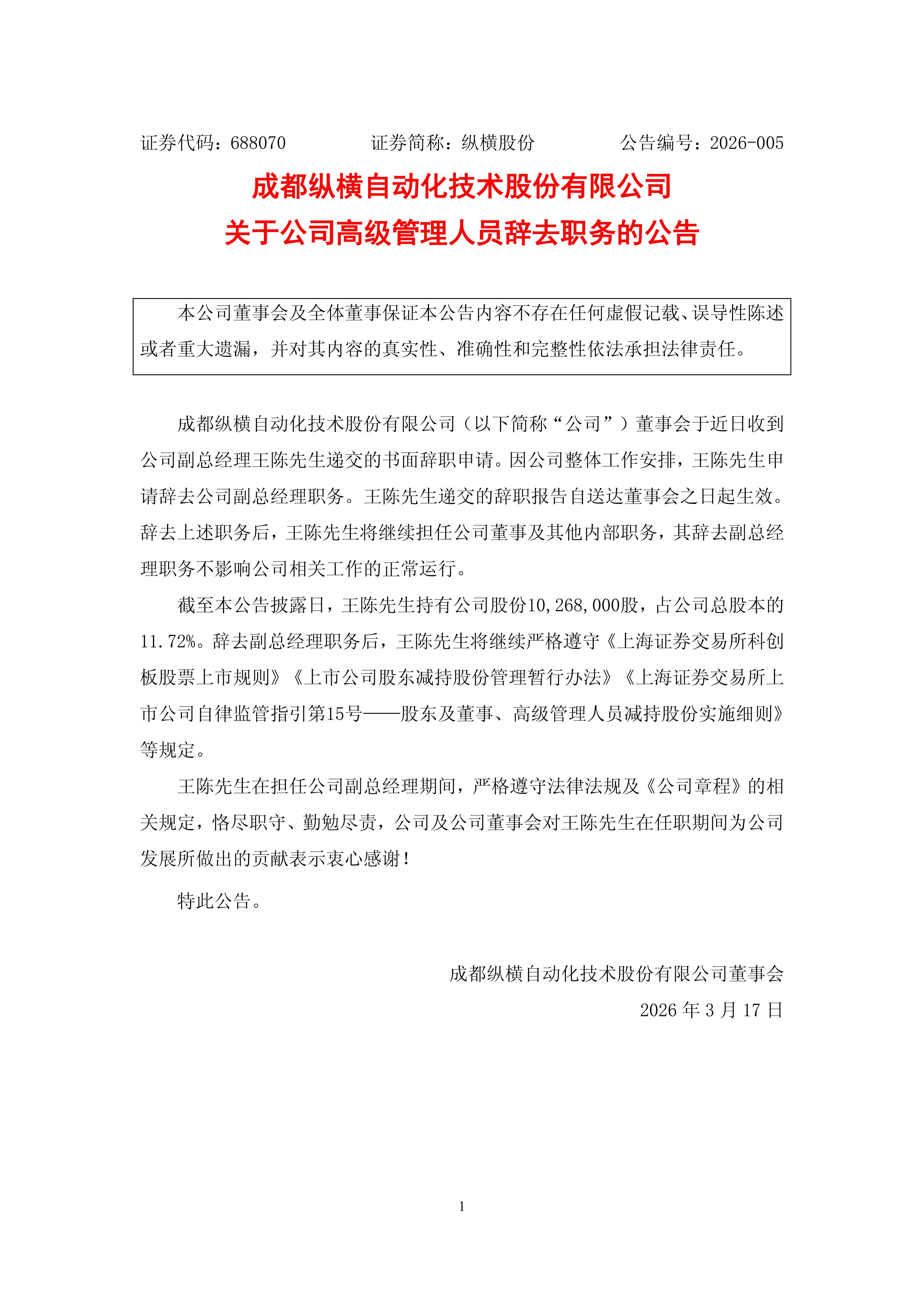 根据公告中披露的持股数据,王陈作为公司核心创始团队成员之一,目前持有纵横股份10268000股,占公司总股本的11.72%。