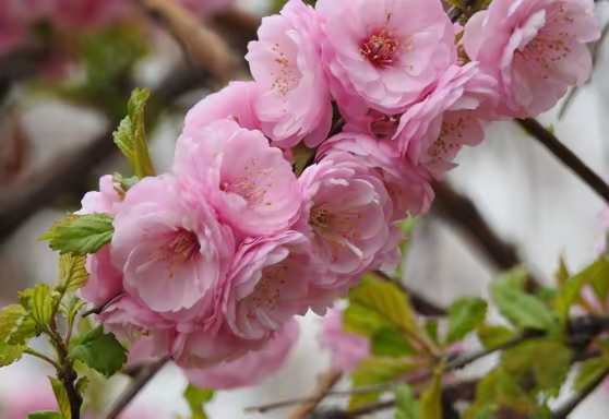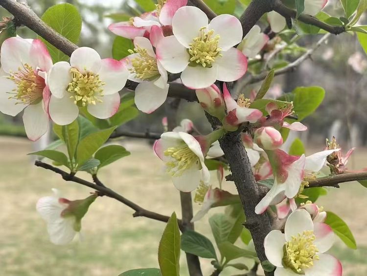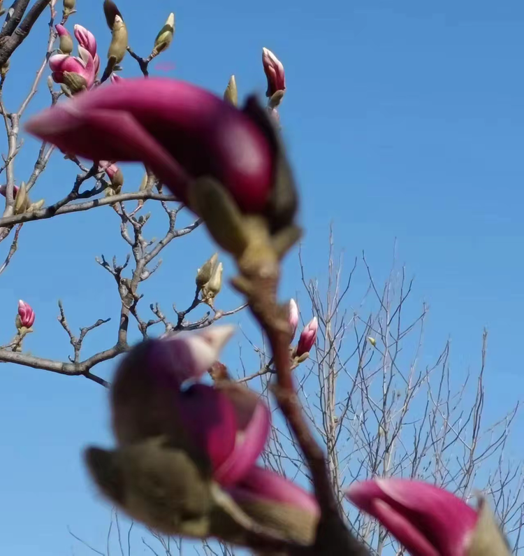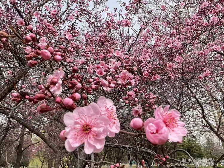 红石公园的春天,从赭红色岩石间悄然开始。玉兰最先擎起满树杯盏,白的如雪,粉的似霞,在赭红色岩石的映衬下格外清雅。紧接着,美人梅绽放,细密的粉红花朵缀满枝头,远望如绯红的轻雾。杏花素雅洁净,在春风里摇曳;海棠成串垂下,如烟如雾,花瓣随风飘落,铺成粉色小径。从玉兰的清雅到海棠的温柔,红石公园的春天一层一层开进人心里。
